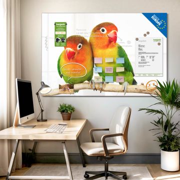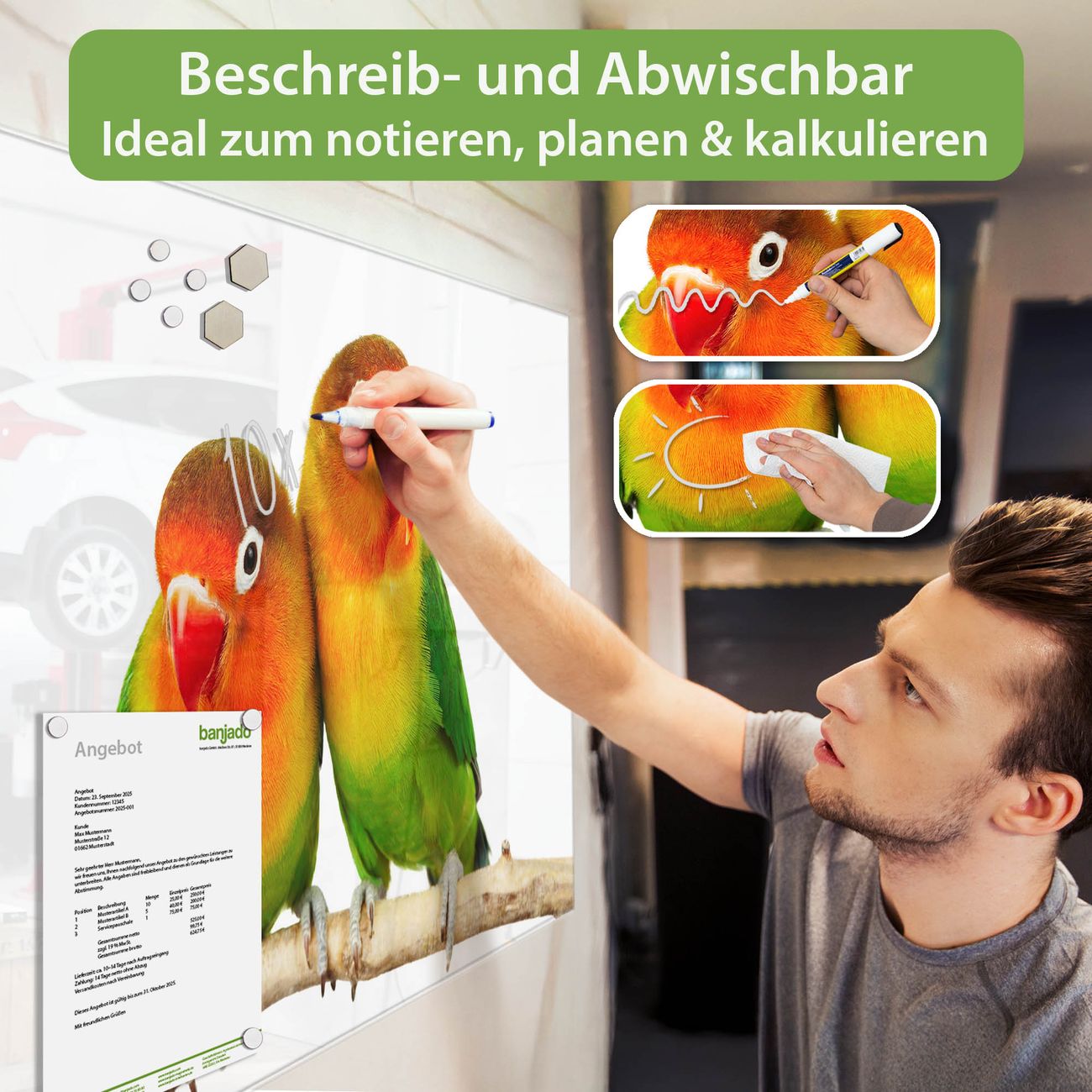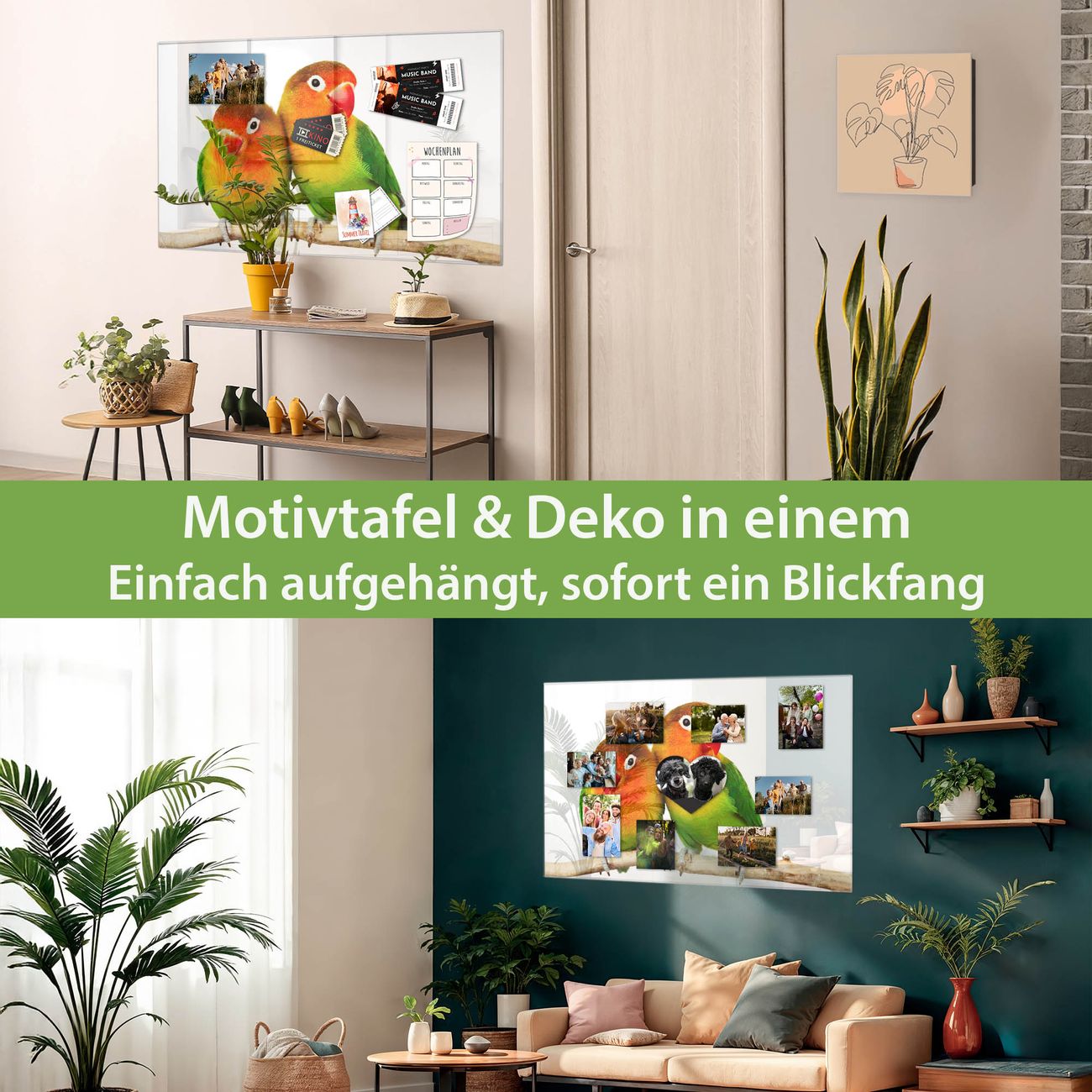 Ein Stück Design, das Ihren Alltag organisiert. Schreiben, heften, inspirieren - alles an einem Ort. Qualität, die man spürt. Montage leicht gemacht. Handwerk mit Herz - veredelt in Sachsen. Einzigartiges Design mit Motiv Motiv Papageien Beschreibbare Glasoberfläche, leicht zu reinigen Starke Magnetkraft durch Stahlrückwand Inklusive 4 Neodym-Magneten Flexible Montageoptionen Handveredelt in Sachsen - Qualität, die bleibt