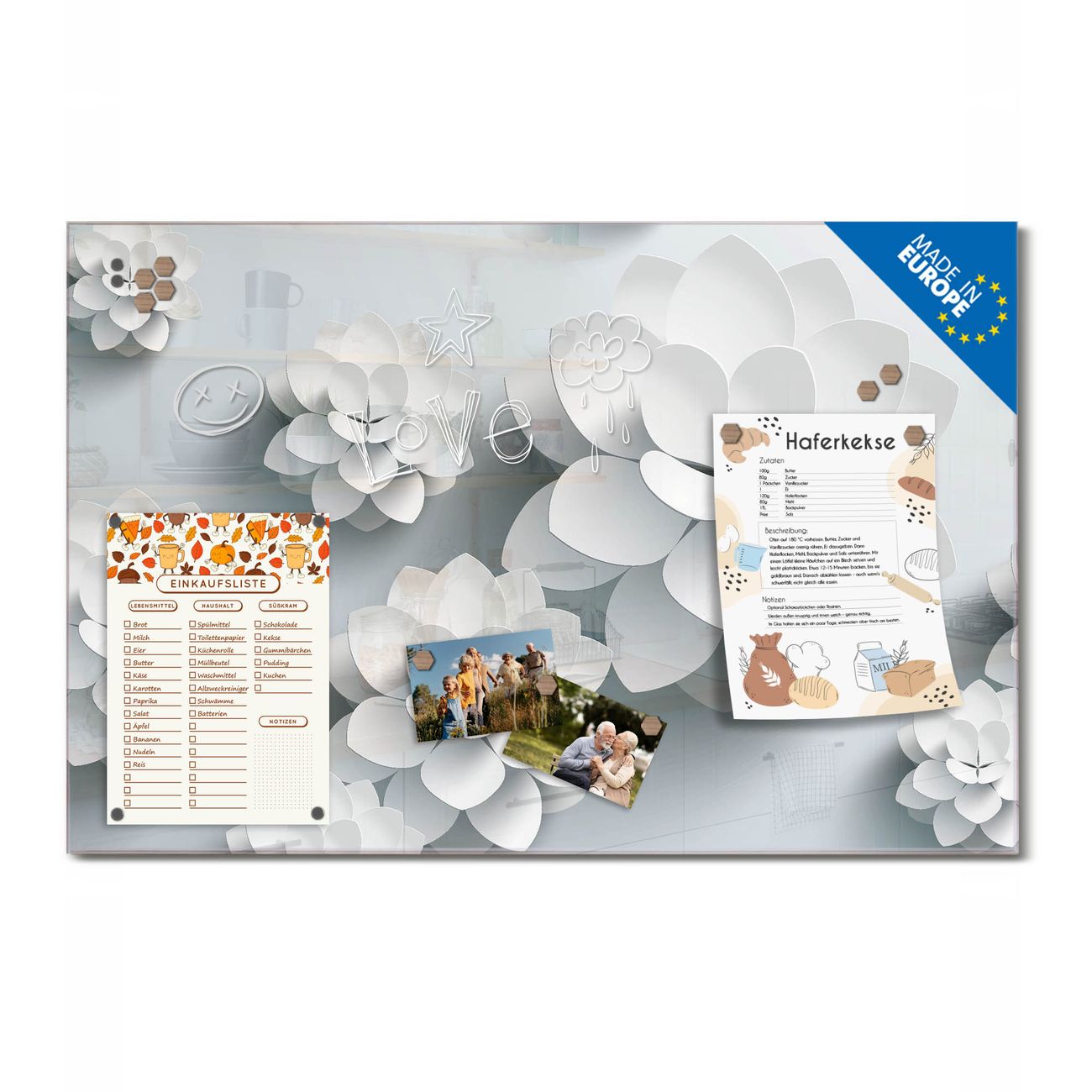 Ein Stück Design, das Ihren Alltag organisiert. Schreiben, heften, inspirieren - alles an einem Ort. Qualität, die man spürt. Montage leicht gemacht. Handwerk mit Herz - veredelt in Sachsen. Einzigartiges Design mit Motiv Motiv Papier Lotus Beschreibbare Glasoberfläche, leicht zu reinigen Starke Magnetkraft durch Stahlrückwand Inklusive 4 Neodym-Magneten Flexible Montageoptionen Handveredelt in Sachsen - Qualität, die bleibt