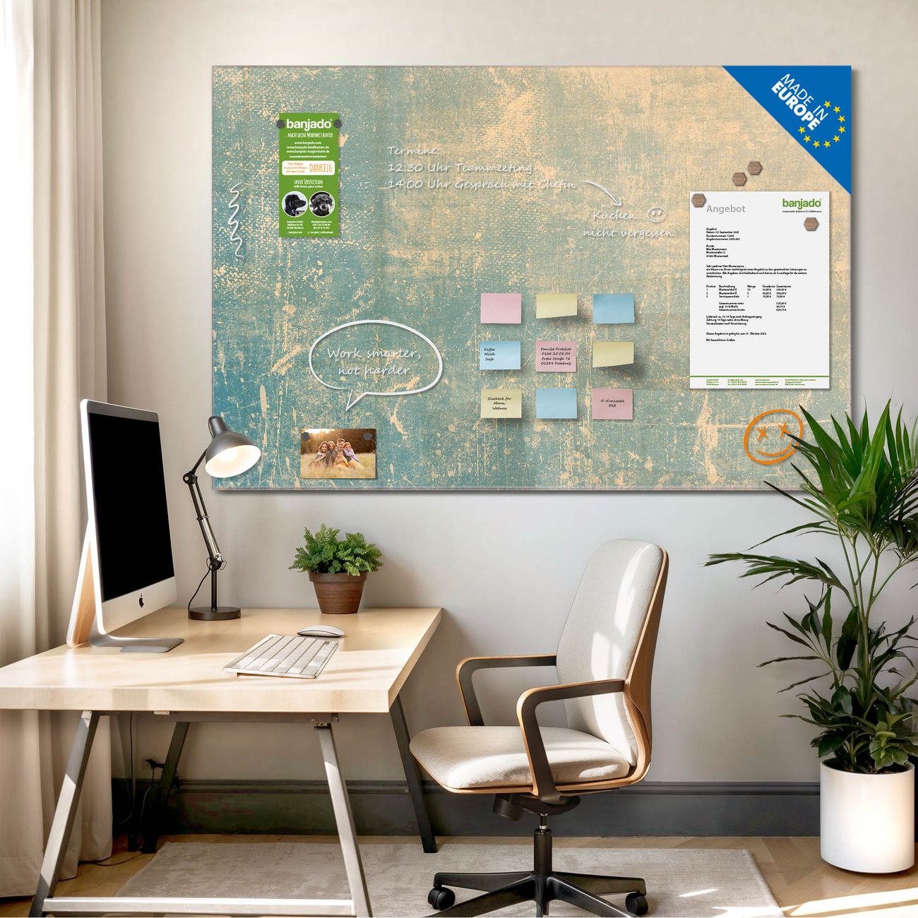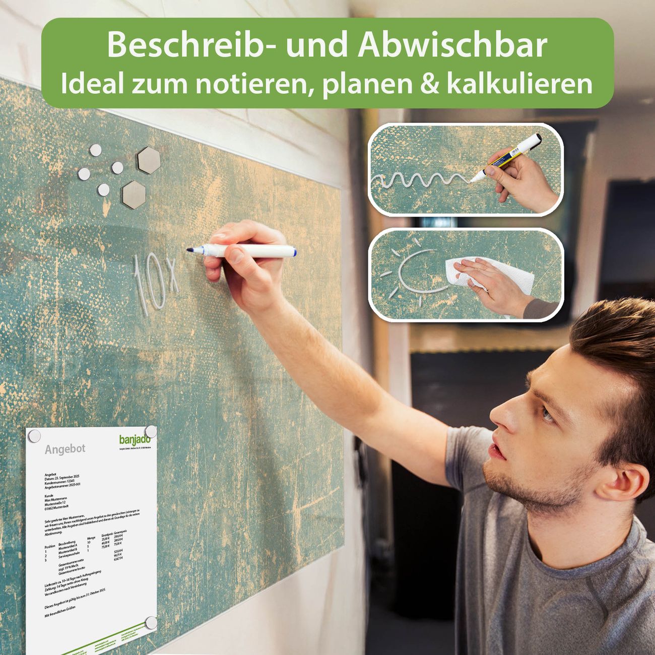 Jede Glas Magnettafel wird in unserer Werkstatt von Hand gefertigt und sorgfältig geprüft. So erhalten Sie ein echtes Qualitätsprodukt, das Funktion und Ästhetik perfekt vereint.?? Warum banjado?