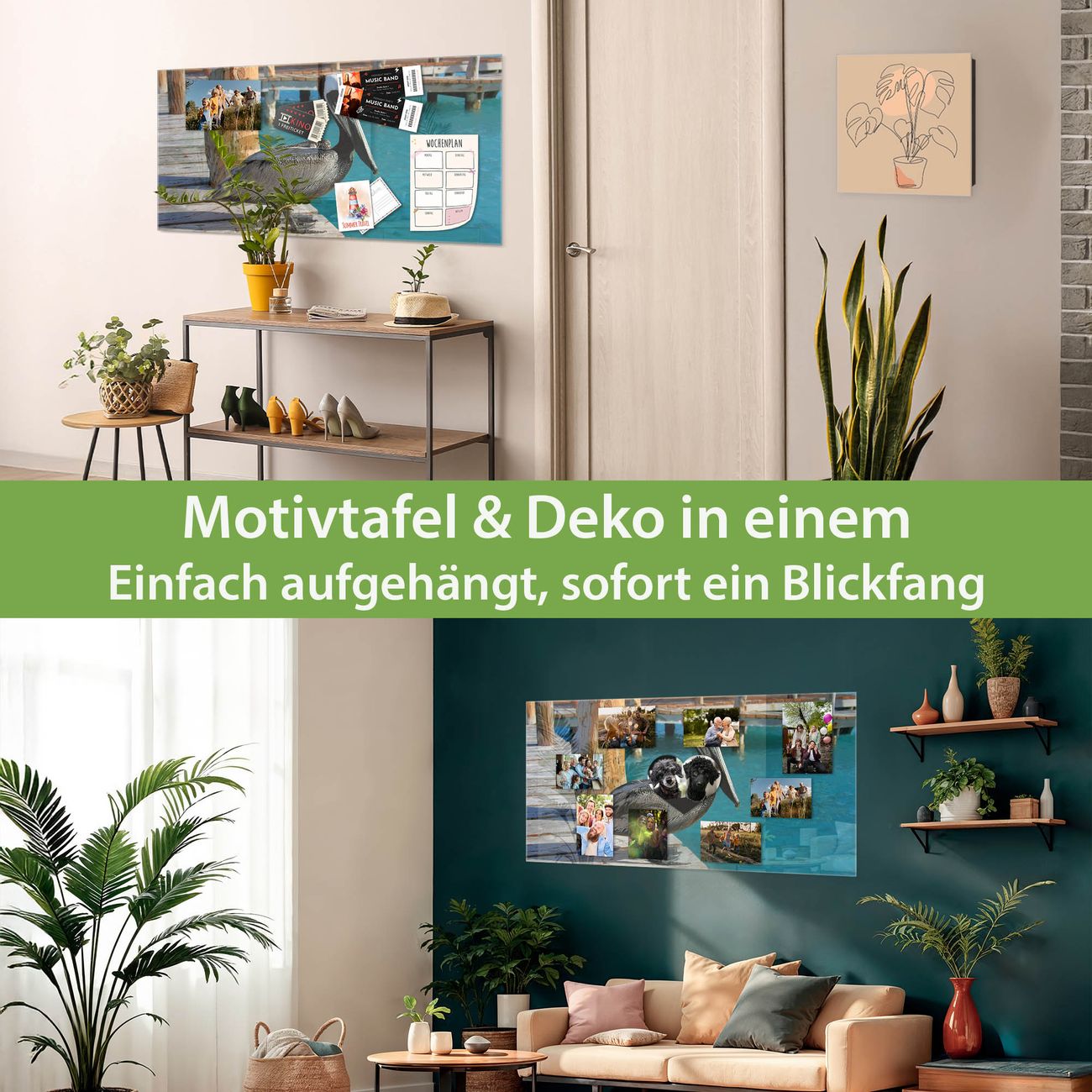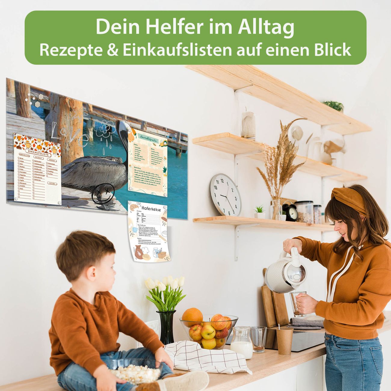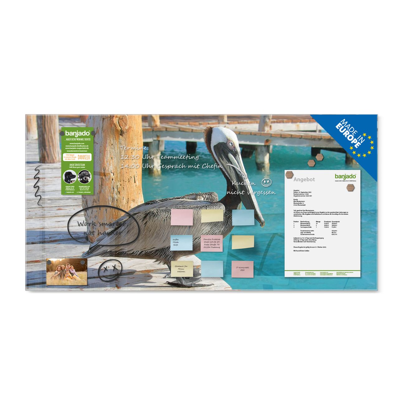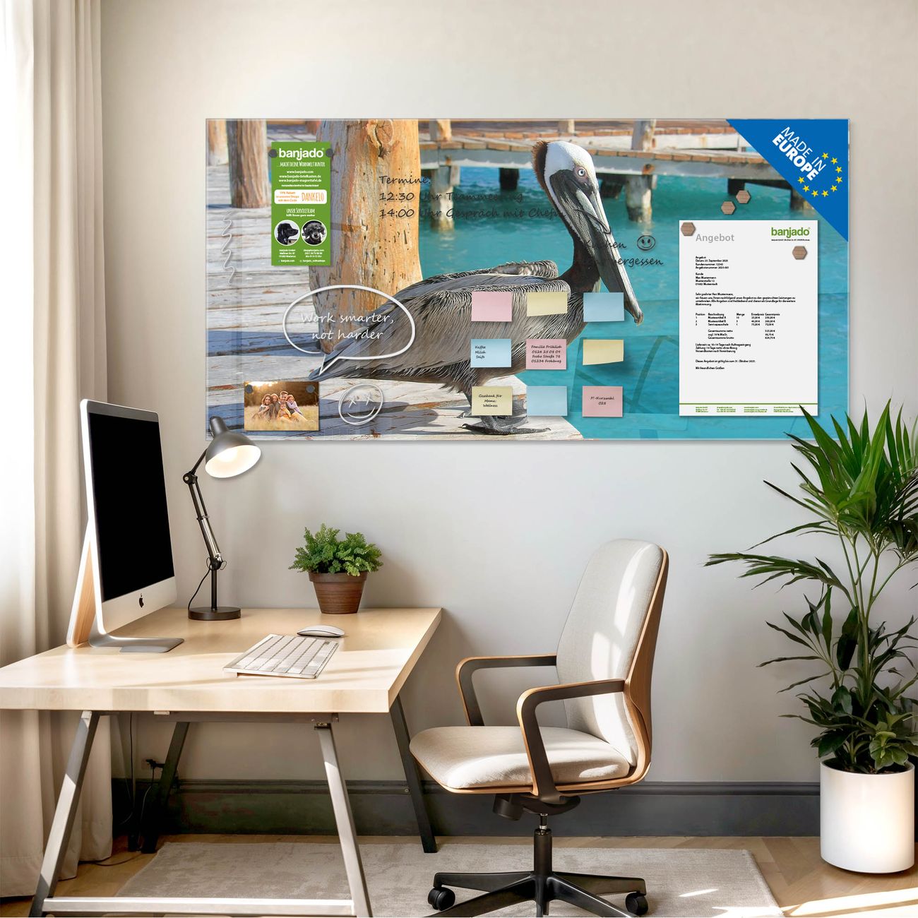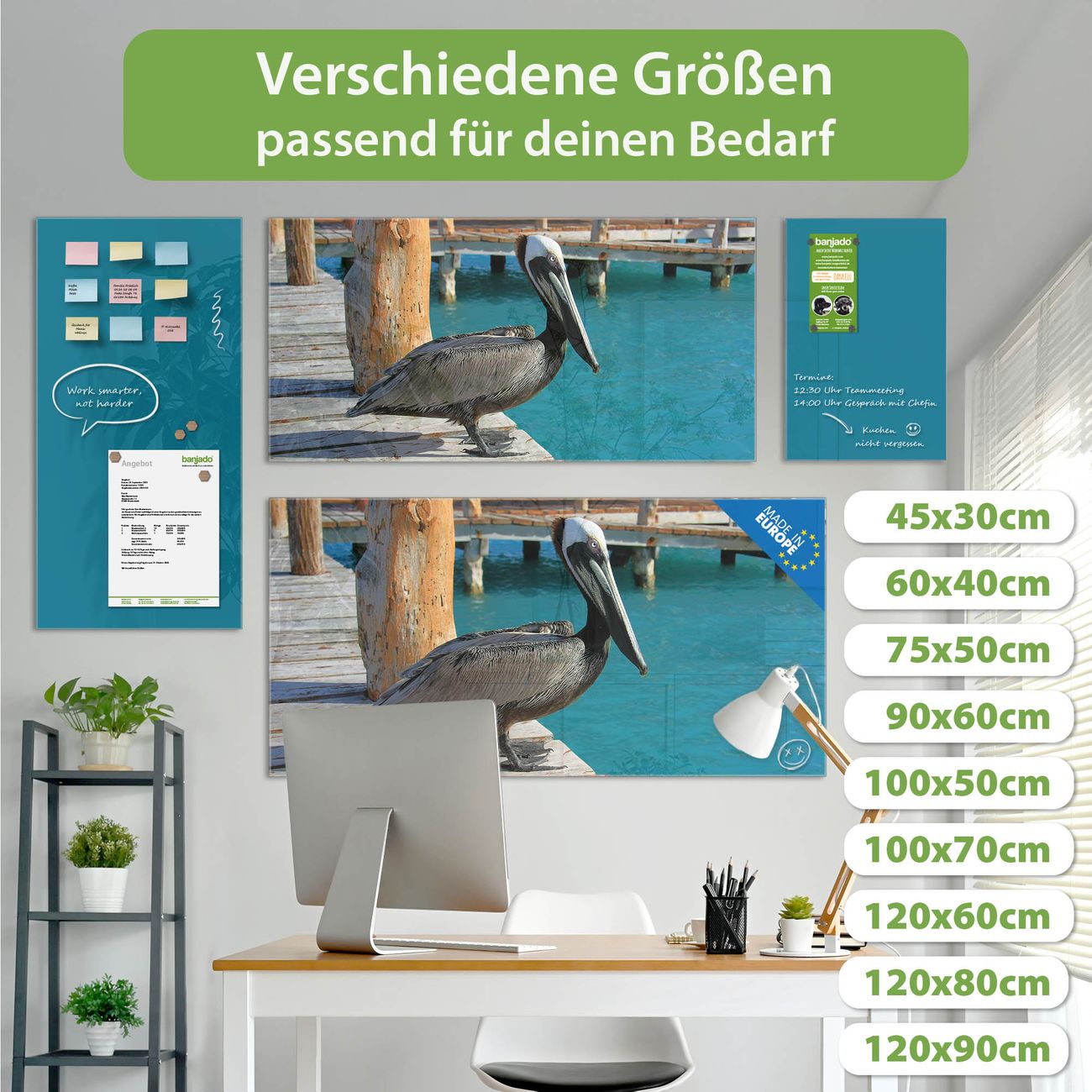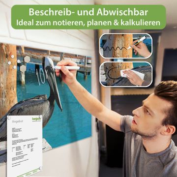 Die banjado Glas Magnettafel mit dem Motiv Motiv Pelikan verbindet Funktionalität mit Stil. Sie ersetzt das Zettelchaos durch klare Strukturen und bringt dabei eine warme, natürliche Atmosphäre in Ihr Zuhause. Ob im Büro, in der Küche oder im Eingangsbereich - dieses Design-Board zieht Blicke an und sorgt für Ordnung mit Charakter.