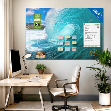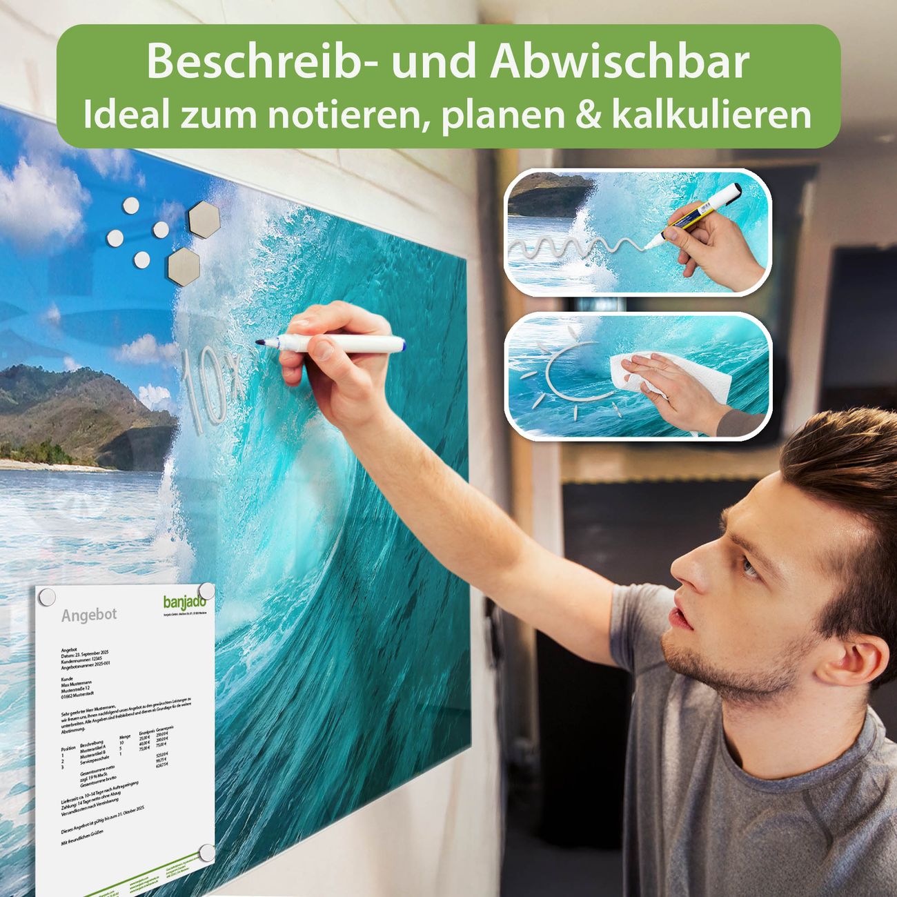 Die banjado Glas Magnettafel mit dem Motiv Motiv Perfekte Welle verbindet Funktionalität mit Stil. Sie ersetzt das Zettelchaos durch klare Strukturen und bringt dabei eine warme, natürliche Atmosphäre in Ihr Zuhause. Ob im Büro, in der Küche oder im Eingangsbereich - dieses Design-Board zieht Blicke an und sorgt für Ordnung mit Charakter.