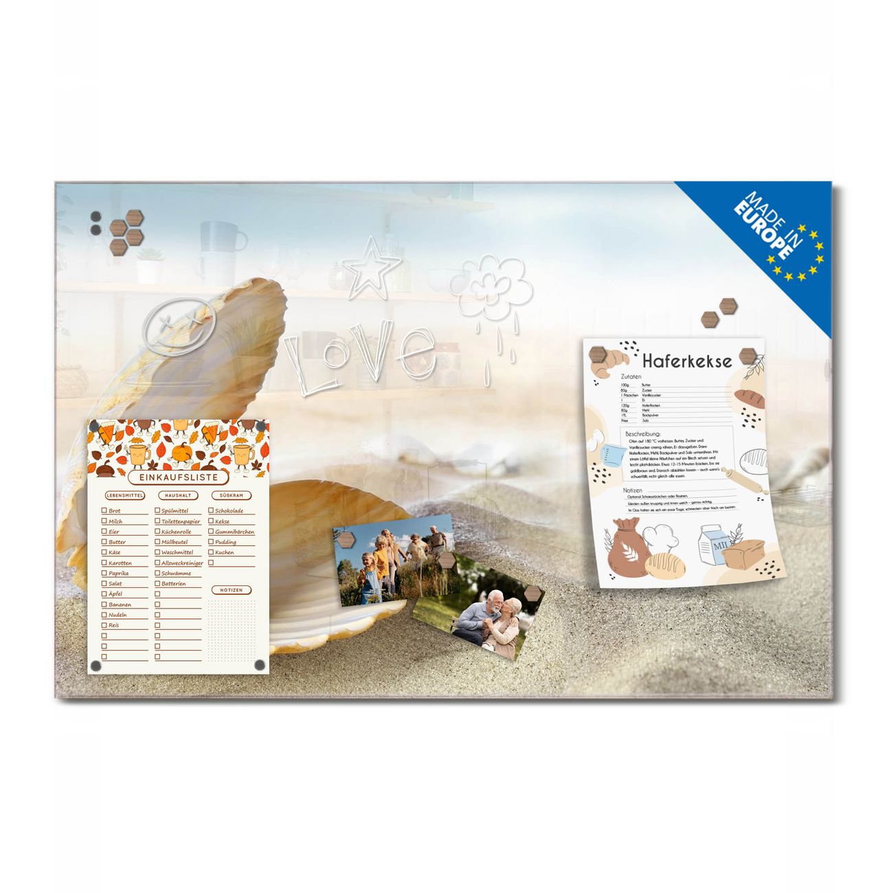 Ein Stück Design, das Ihren Alltag organisiert. Schreiben, heften, inspirieren - alles an einem Ort. Qualität, die man spürt. Montage leicht gemacht. Handwerk mit Herz - veredelt in Sachsen. Einzigartiges Design mit Motiv Motiv Perlenmuschel Beschreibbare Glasoberfläche, leicht zu reinigen Starke Magnetkraft durch Stahlrückwand Inklusive 4 Neodym-Magneten Flexible Montageoptionen Handveredelt in Sachsen - Qualität, die bleibt