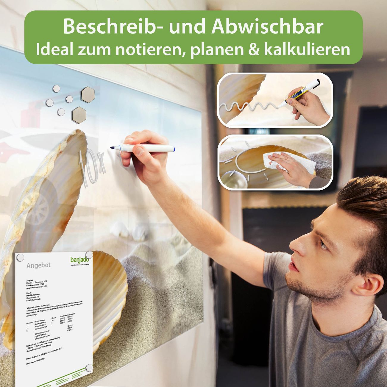 Jede Glas Magnettafel wird in unserer Werkstatt von Hand gefertigt und sorgfältig geprüft. So erhalten Sie ein echtes Qualitätsprodukt, das Funktion und Ästhetik perfekt vereint.?? Warum banjado?