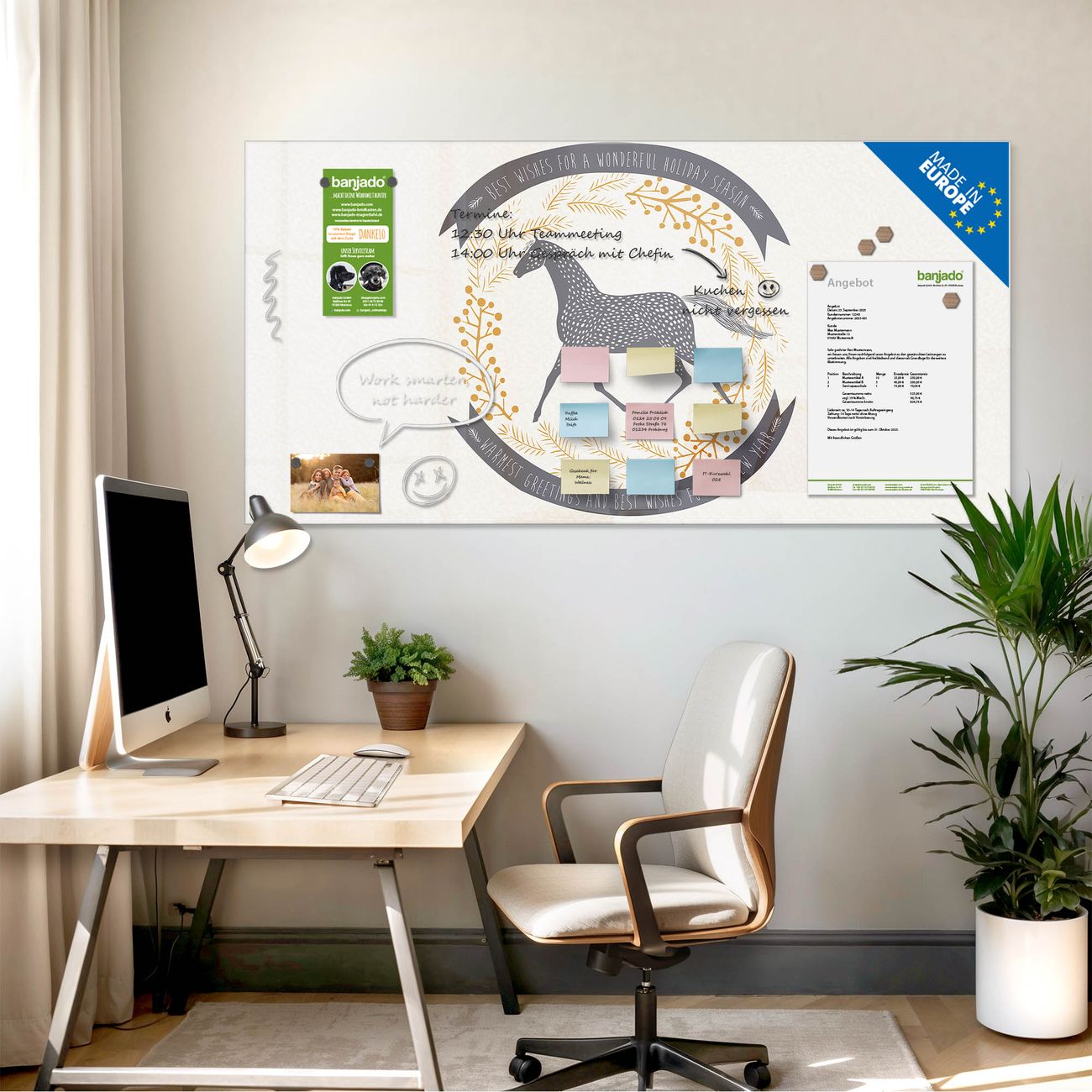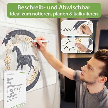 Die banjado Glas Magnettafel mit dem Motiv Motiv Pferd und Vogel verbindet Funktionalität mit Stil. Sie ersetzt das Zettelchaos durch klare Strukturen und bringt dabei eine warme, natürliche Atmosphäre in Ihr Zuhause. Ob im Büro, in der Küche oder im Eingangsbereich - dieses Design-Board zieht Blicke an und sorgt für Ordnung mit Charakter.