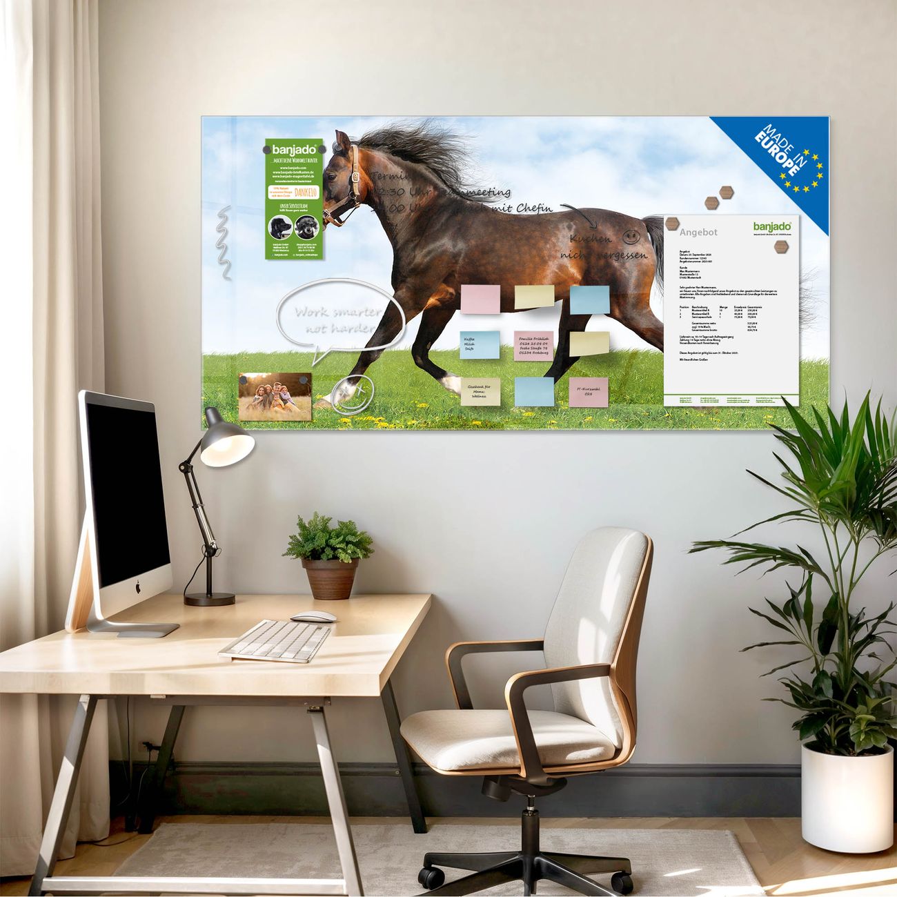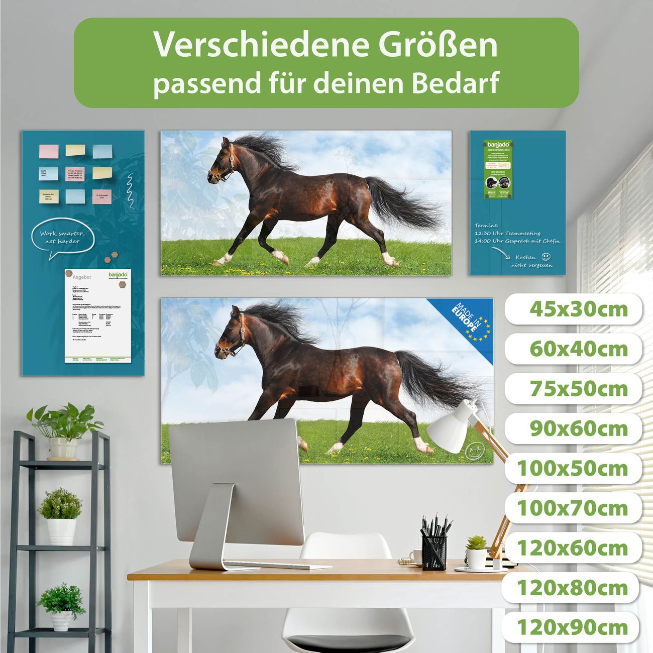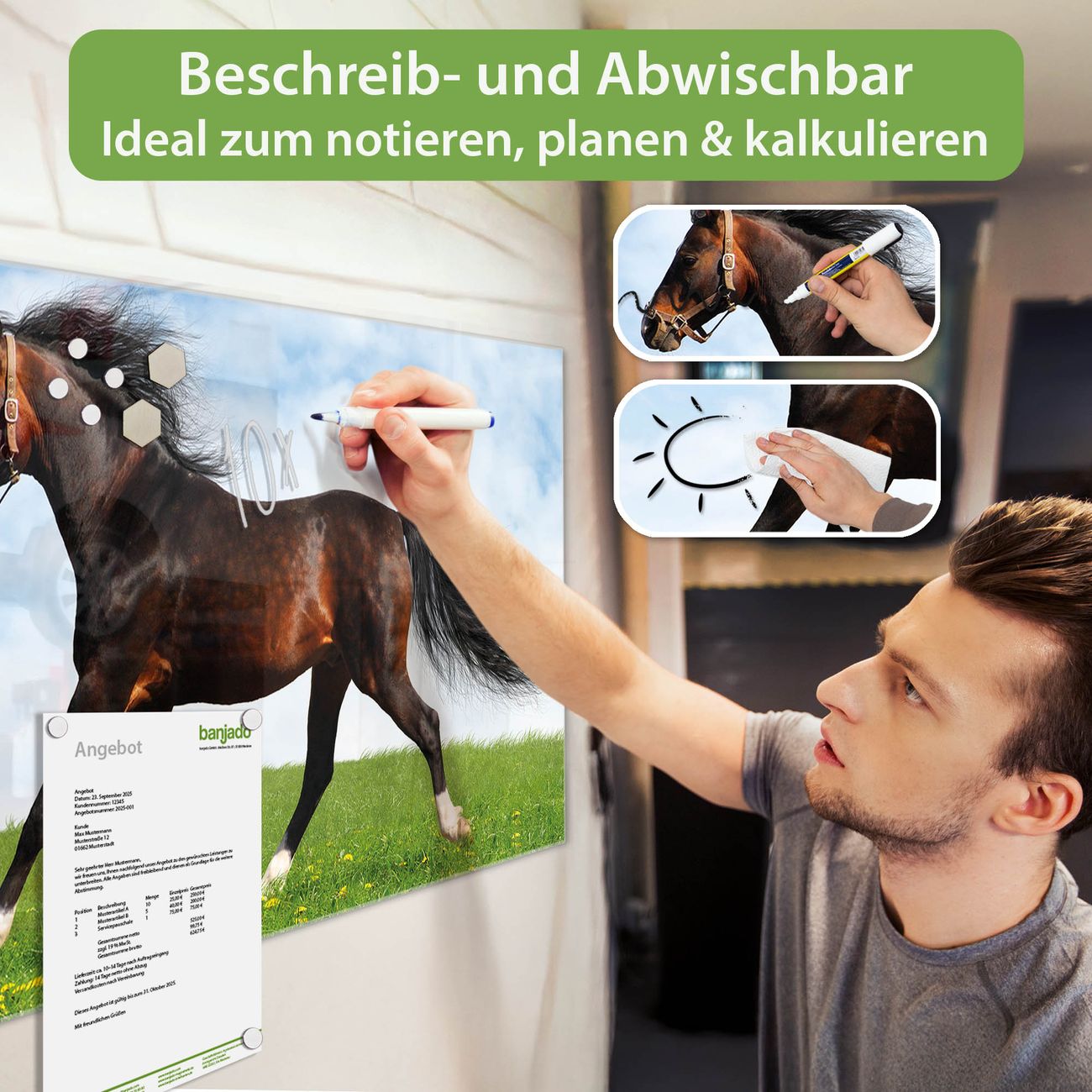 Die banjado Glas Magnettafel mit dem Motiv Motiv Pferd verbindet Funktionalität mit Stil. Sie ersetzt das Zettelchaos durch klare Strukturen und bringt dabei eine warme, natürliche Atmosphäre in Ihr Zuhause. Ob im Büro, in der Küche oder im Eingangsbereich - dieses Design-Board zieht Blicke an und sorgt für Ordnung mit Charakter.