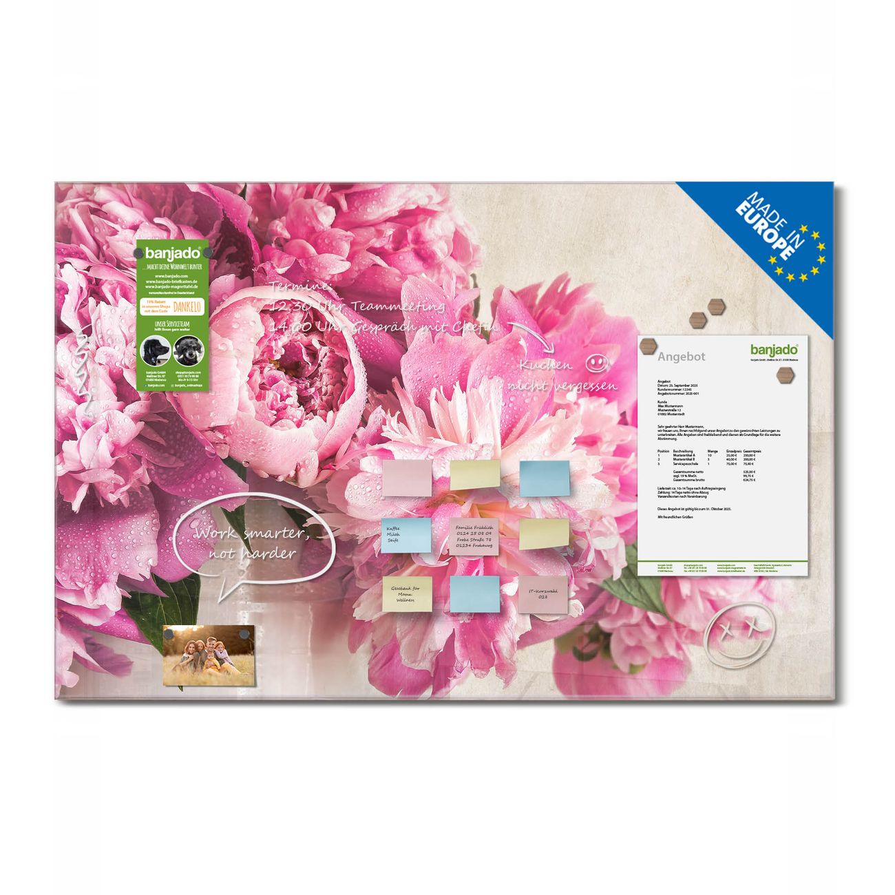 Jede Glas Magnettafel wird in unserer Werkstatt von Hand gefertigt und sorgfältig geprüft. So erhalten Sie ein echtes Qualitätsprodukt, das Funktion und Ästhetik perfekt vereint.?? Warum banjado?