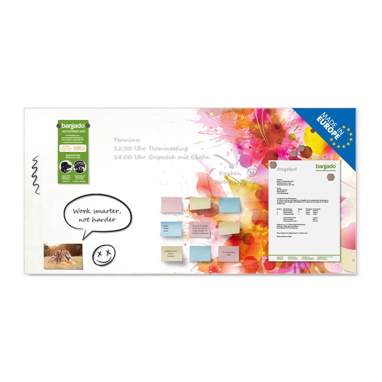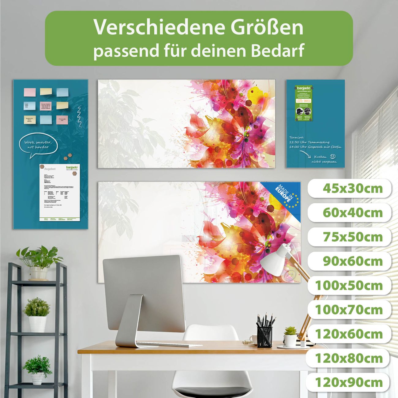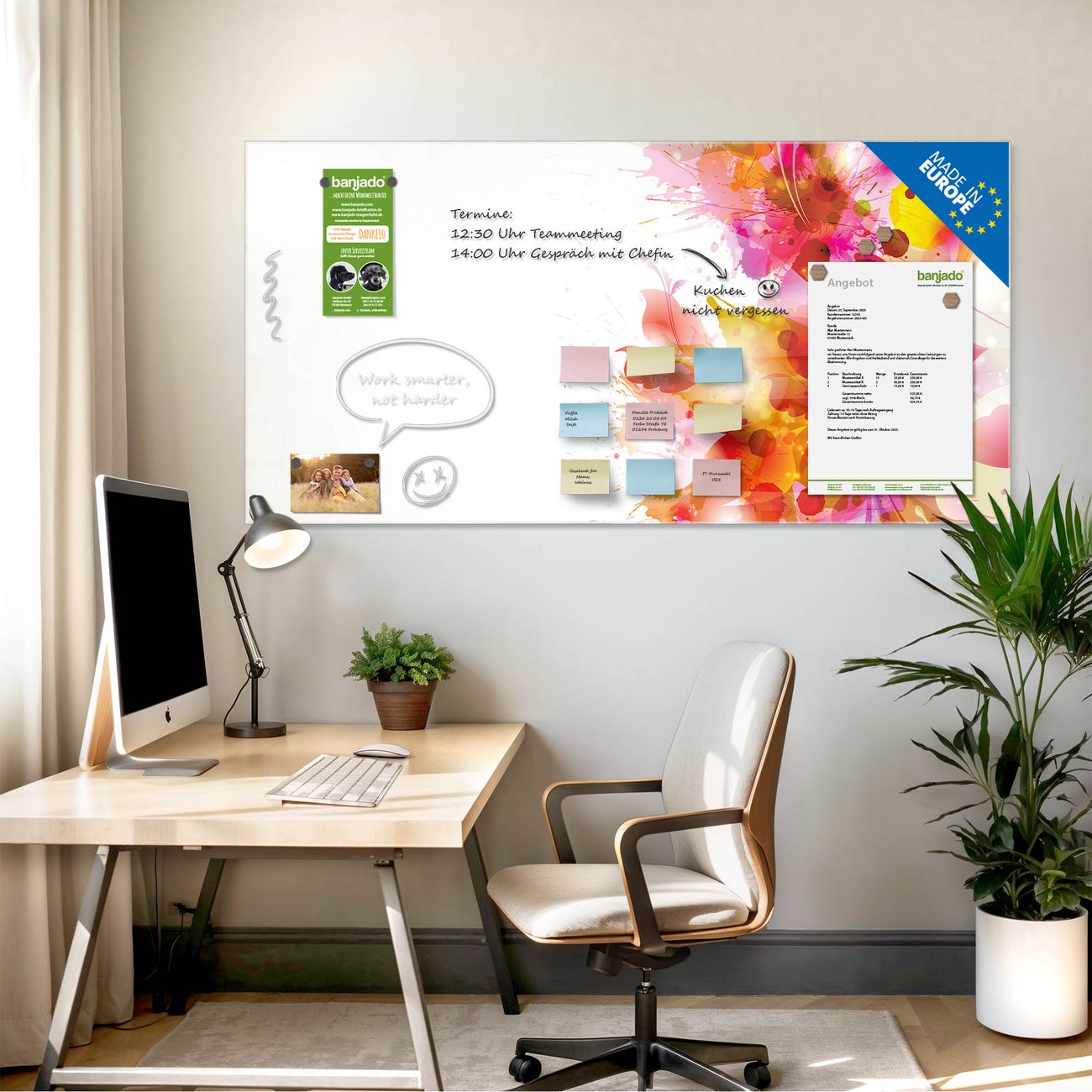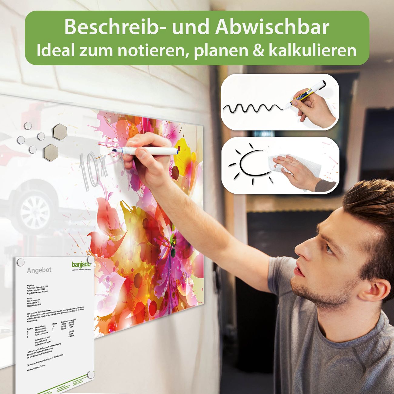 Jede Glas Magnettafel wird in unserer Werkstatt von Hand gefertigt und sorgfältig geprüft. So erhalten Sie ein echtes Qualitätsprodukt, das Funktion und Ästhetik perfekt vereint.?? Warum banjado?