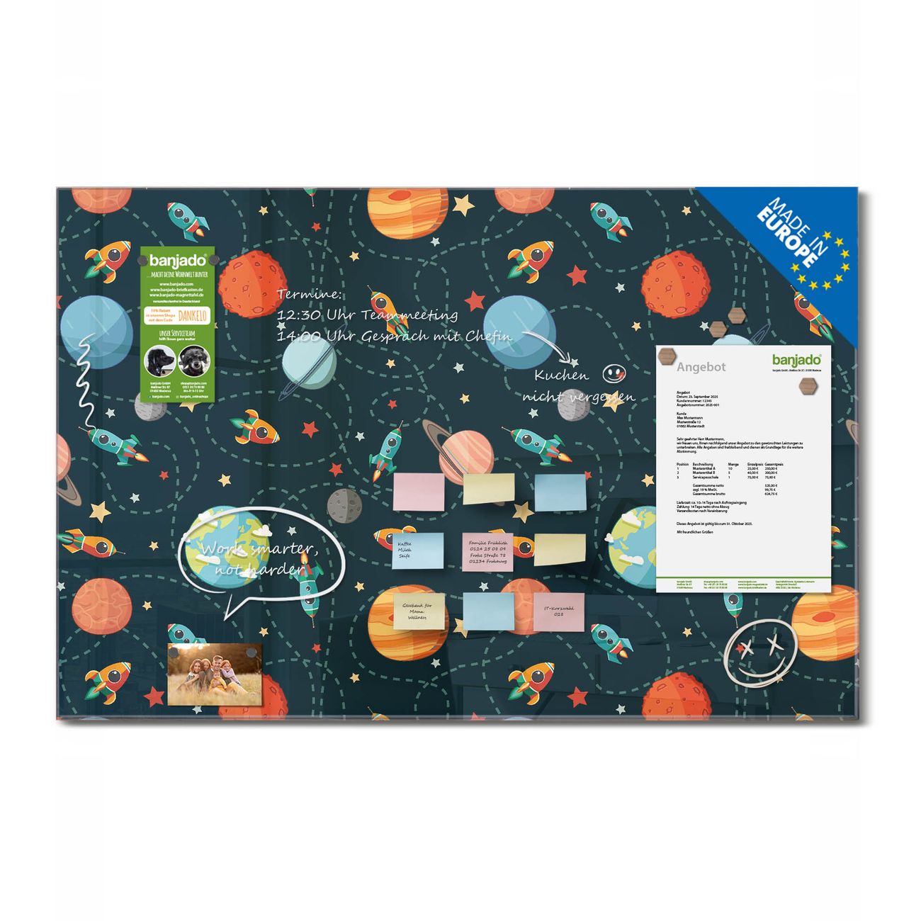 Ein Stück Design, das Ihren Alltag organisiert. Schreiben, heften, inspirieren - alles an einem Ort. Qualität, die man spürt. Montage leicht gemacht. Handwerk mit Herz - veredelt in Sachsen. Einzigartiges Design mit Motiv Motiv Planet Cruiser Beschreibbare Glasoberfläche, leicht zu reinigen Starke Magnetkraft durch Stahlrückwand Inklusive 4 Neodym-Magneten Flexible Montageoptionen Handveredelt in Sachsen - Qualität, die bleibt