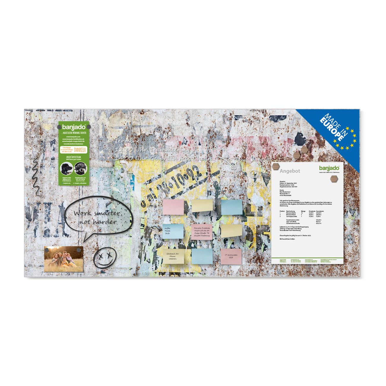 Jede Glas Magnettafel wird in unserer Werkstatt von Hand gefertigt und sorgfältig geprüft. So erhalten Sie ein echtes Qualitätsprodukt, das Funktion und Ästhetik perfekt vereint.?? Warum banjado?