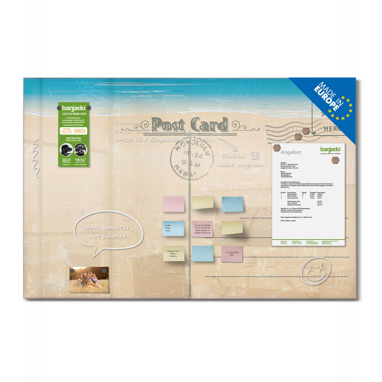 Die banjado Glas Magnettafel mit dem Motiv Motiv Postkarte verbindet Funktionalität mit Stil. Sie ersetzt das Zettelchaos durch klare Strukturen und bringt dabei eine warme, natürliche Atmosphäre in Ihr Zuhause. Ob im Büro, in der Küche oder im Eingangsbereich - dieses Design-Board zieht Blicke an und sorgt für Ordnung mit Charakter.