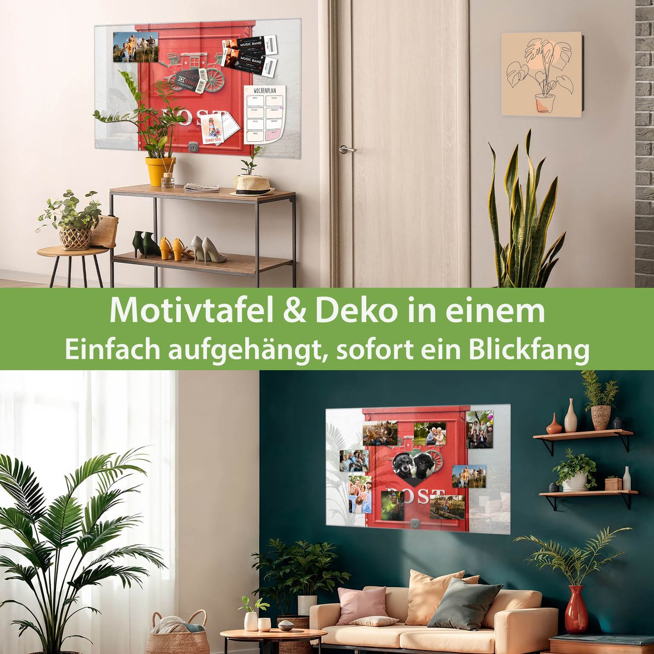 Ein Stück Design, das Ihren Alltag organisiert. Schreiben, heften, inspirieren - alles an einem Ort. Qualität, die man spürt. Montage leicht gemacht. Handwerk mit Herz - veredelt in Sachsen. Einzigartiges Design mit Motiv Motiv Postkasten Nostalgie Beschreibbare Glasoberfläche, leicht zu reinigen Starke Magnetkraft durch Stahlrückwand Inklusive 4 Neodym-Magneten Flexible Montageoptionen Handveredelt in Sachsen - Qualität, die bleibt