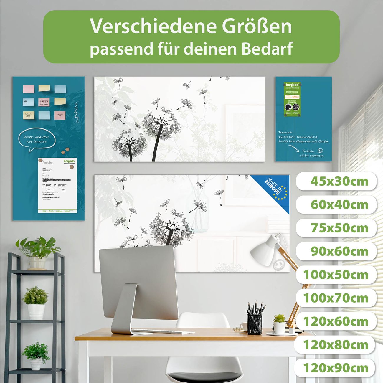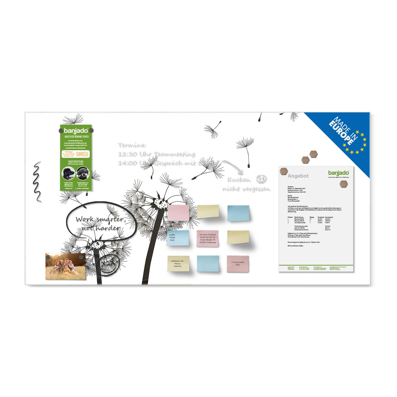 Jede Glas Magnettafel wird in unserer Werkstatt von Hand gefertigt und sorgfältig geprüft. So erhalten Sie ein echtes Qualitätsprodukt, das Funktion und Ästhetik perfekt vereint.?? Warum banjado?