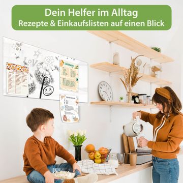 Auf der glatten Glasoberfläche lassen sich Termine, Rezepte oder Notizen ganz einfach mit Kreidestiften festhalten und rückstandslos entfernen. Starke Neodym-Magnete halten Ihre wichtigsten Erinnerungen sicher an Ort und Stelle. So entsteht Ihre ganz persönliche Ideenwand - jeden Tag neu.