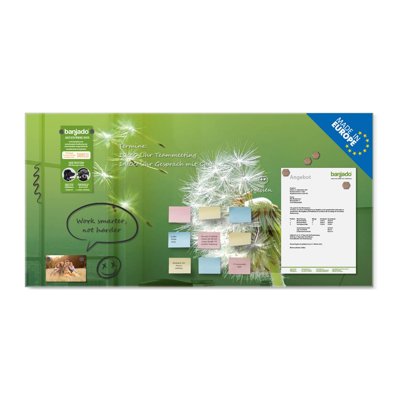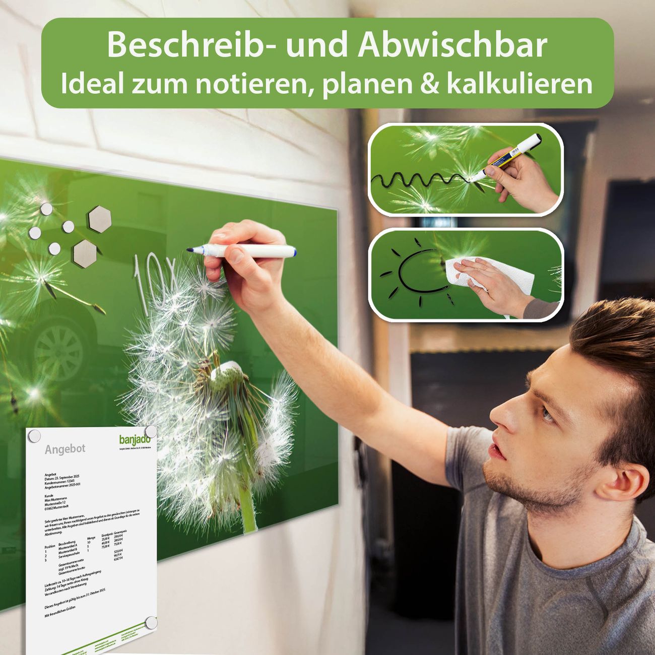 Jede Glas Magnettafel wird in unserer Werkstatt von Hand gefertigt und sorgfältig geprüft. So erhalten Sie ein echtes Qualitätsprodukt, das Funktion und Ästhetik perfekt vereint.?? Warum banjado?