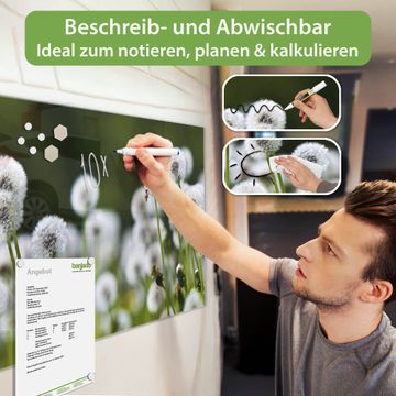 Die banjado Glas Magnettafel mit dem Motiv Motiv Pusteblumenwiese verbindet Funktionalität mit Stil. Sie ersetzt das Zettelchaos durch klare Strukturen und bringt dabei eine warme, natürliche Atmosphäre in Ihr Zuhause. Ob im Büro, in der Küche oder im Eingangsbereich - dieses Design-Board zieht Blicke an und sorgt für Ordnung mit Charakter.