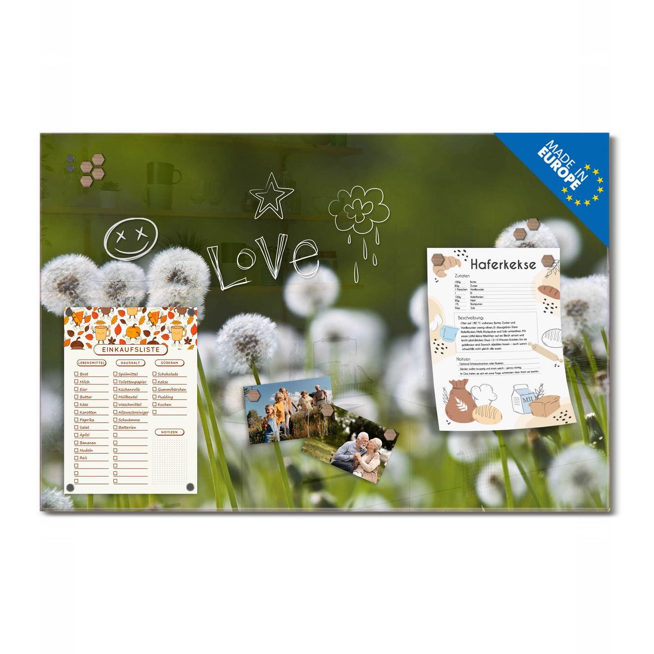 Ein Stück Design, das Ihren Alltag organisiert. Schreiben, heften, inspirieren - alles an einem Ort. Qualität, die man spürt. Montage leicht gemacht. Handwerk mit Herz - veredelt in Sachsen. Einzigartiges Design mit Motiv Motiv Pusteblumenwiese Beschreibbare Glasoberfläche, leicht zu reinigen Starke Magnetkraft durch Stahlrückwand Inklusive 4 Neodym-Magneten Flexible Montageoptionen Handveredelt in Sachsen - Qualität, die bleibt