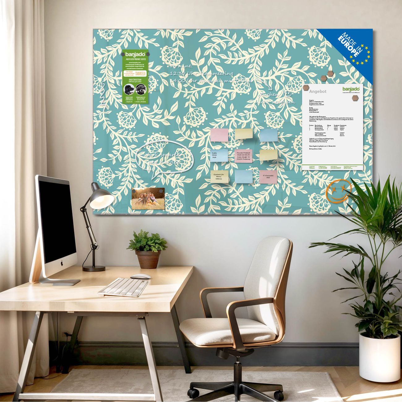 Die banjado Glas Magnettafel mit dem Motiv Motiv Rankenornament verbindet Funktionalität mit Stil. Sie ersetzt das Zettelchaos durch klare Strukturen und bringt dabei eine warme, natürliche Atmosphäre in Ihr Zuhause. Ob im Büro, in der Küche oder im Eingangsbereich - dieses Design-Board zieht Blicke an und sorgt für Ordnung mit Charakter.