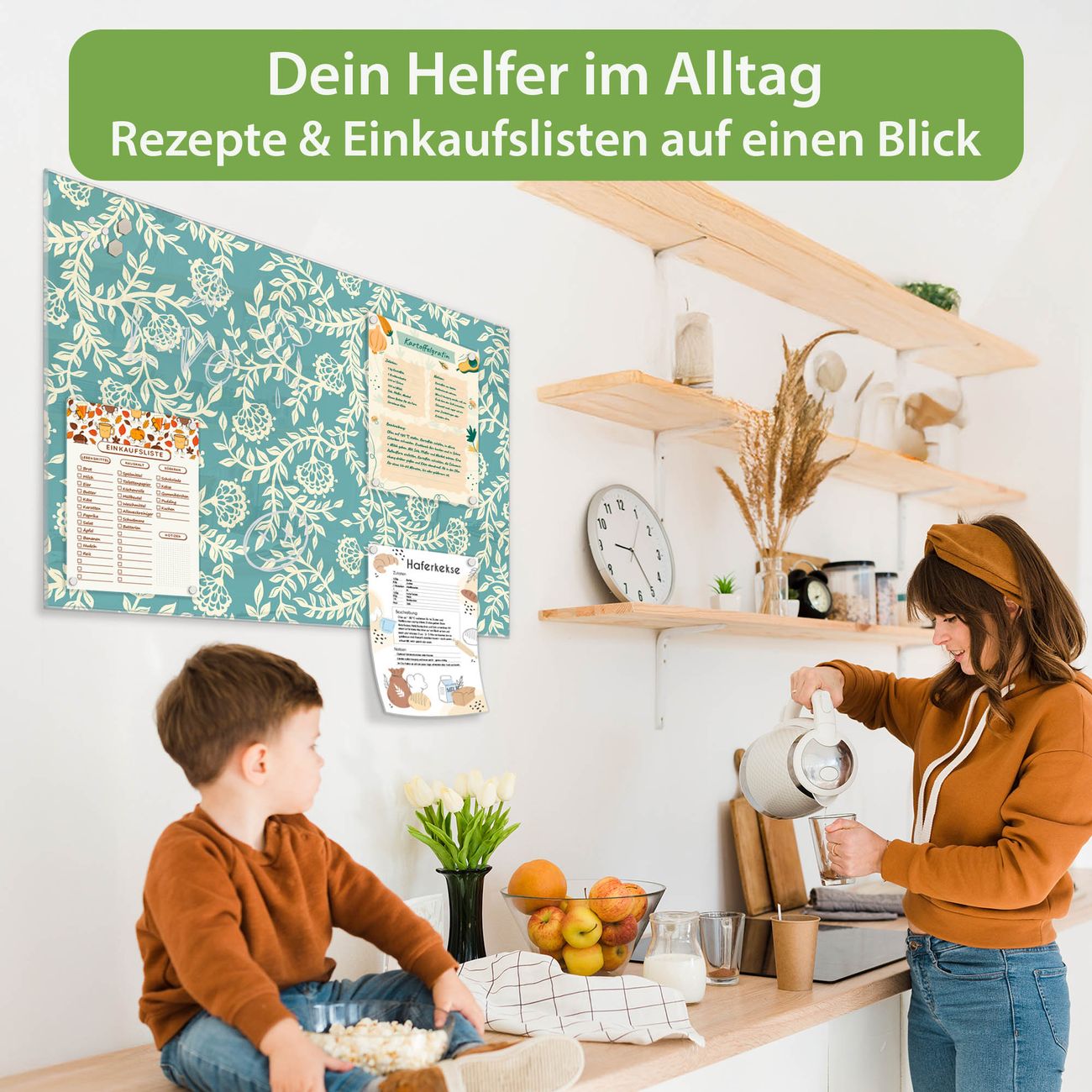 Ein Stück Design, das Ihren Alltag organisiert. Schreiben, heften, inspirieren - alles an einem Ort. Qualität, die man spürt. Montage leicht gemacht. Handwerk mit Herz - veredelt in Sachsen. Einzigartiges Design mit Motiv Motiv Rankenornament Beschreibbare Glasoberfläche, leicht zu reinigen Starke Magnetkraft durch Stahlrückwand Inklusive 4 Neodym-Magneten Flexible Montageoptionen Handveredelt in Sachsen - Qualität, die bleibt
