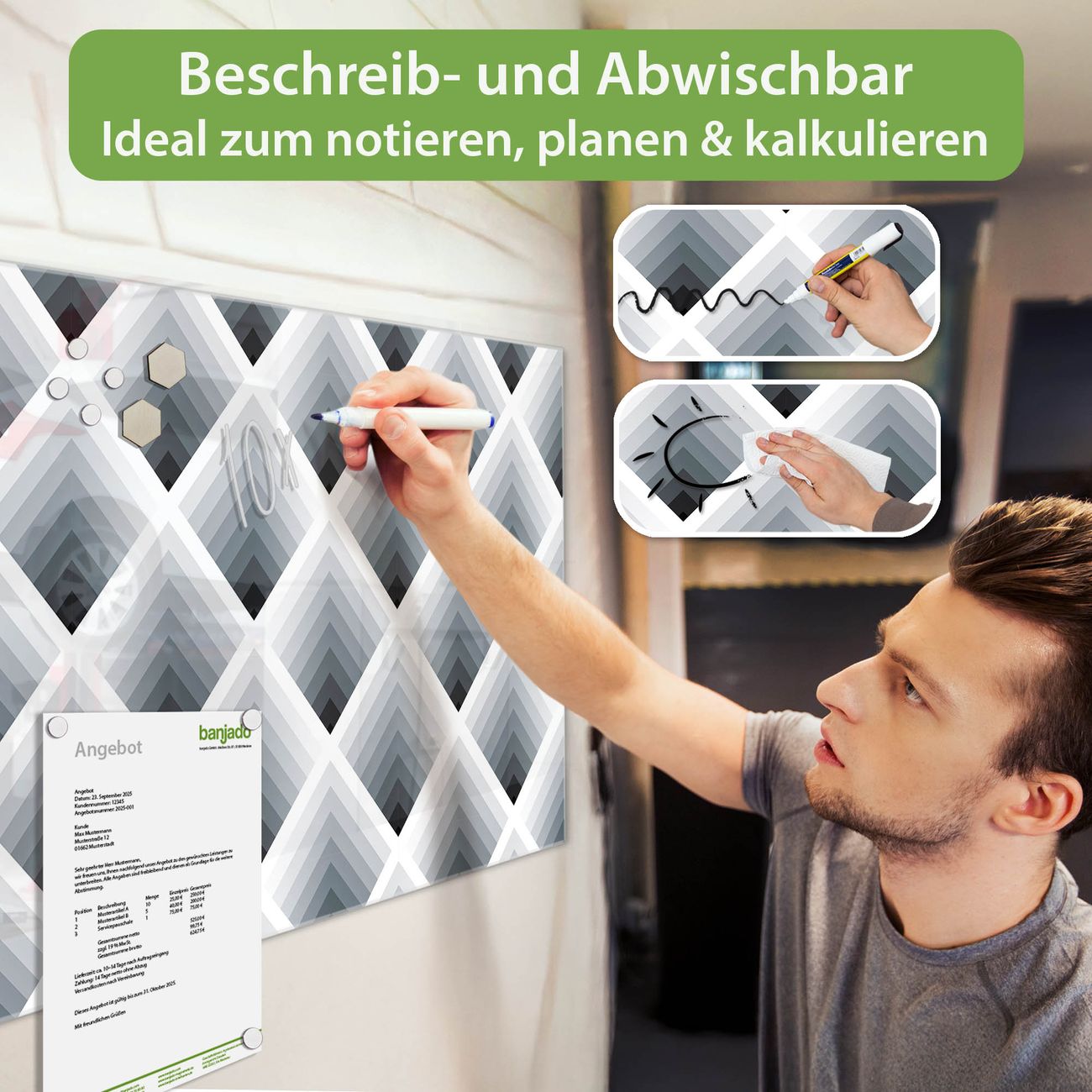 Jede Glas Magnettafel wird in unserer Werkstatt von Hand gefertigt und sorgfältig geprüft. So erhalten Sie ein echtes Qualitätsprodukt, das Funktion und Ästhetik perfekt vereint.?? Warum banjado?