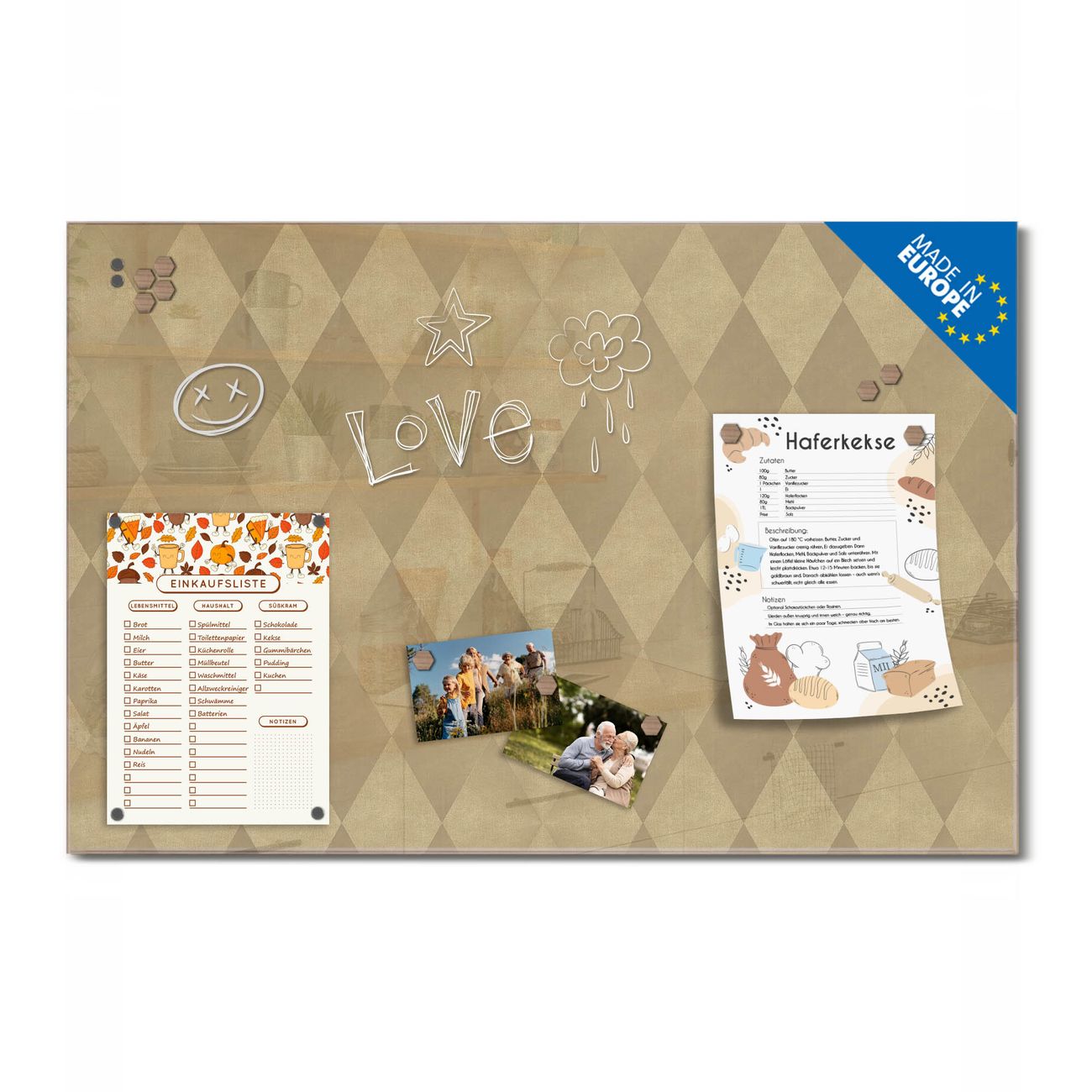 Ein Stück Design, das Ihren Alltag organisiert. Schreiben, heften, inspirieren - alles an einem Ort. Qualität, die man spürt. Montage leicht gemacht. Handwerk mit Herz - veredelt in Sachsen. Einzigartiges Design mit Motiv Motiv Rauten Metall Beschreibbare Glasoberfläche, leicht zu reinigen Starke Magnetkraft durch Stahlrückwand Inklusive 4 Neodym-Magneten Flexible Montageoptionen Handveredelt in Sachsen - Qualität, die bleibt