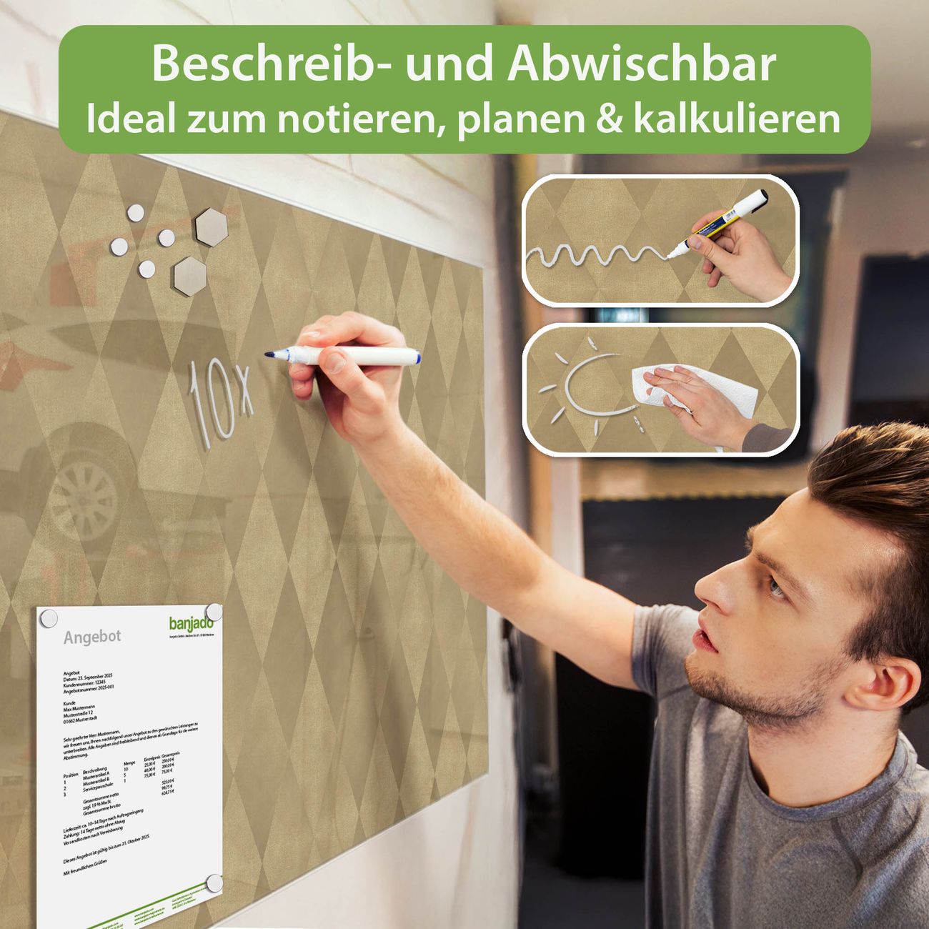 Jede Glas Magnettafel wird in unserer Werkstatt von Hand gefertigt und sorgfältig geprüft. So erhalten Sie ein echtes Qualitätsprodukt, das Funktion und Ästhetik perfekt vereint.?? Warum banjado?