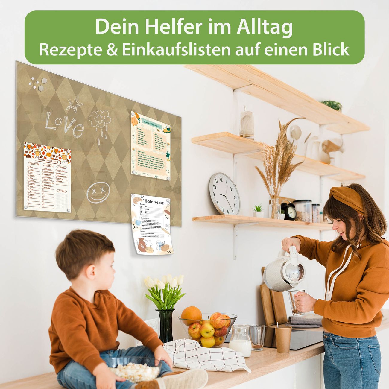 Auf der glatten Glasoberfläche lassen sich Termine, Rezepte oder Notizen ganz einfach mit Kreidestiften festhalten und rückstandslos entfernen. Starke Neodym-Magnete halten Ihre wichtigsten Erinnerungen sicher an Ort und Stelle. So entsteht Ihre ganz persönliche Ideenwand - jeden Tag neu.
