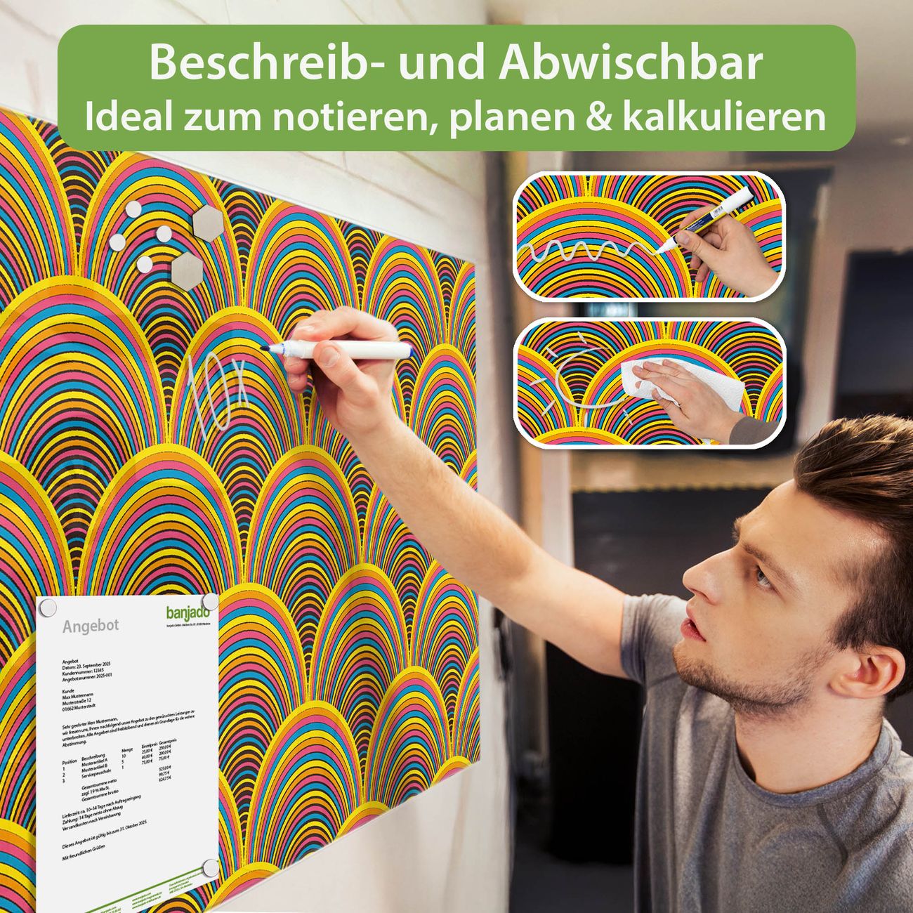 Jede Glas Magnettafel wird in unserer Werkstatt von Hand gefertigt und sorgfältig geprüft. So erhalten Sie ein echtes Qualitätsprodukt, das Funktion und Ästhetik perfekt vereint.?? Warum banjado?
