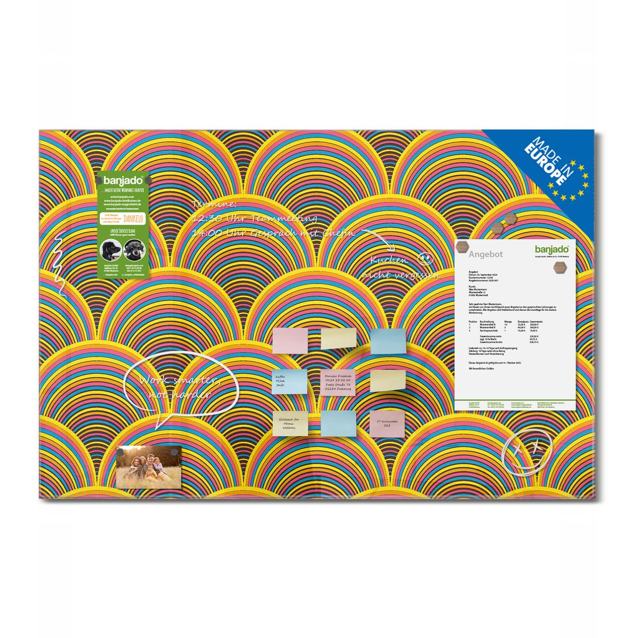 Jede Glas Magnettafel wird in unserer Werkstatt von Hand gefertigt und sorgfältig geprüft. So erhalten Sie ein echtes Qualitätsprodukt, das Funktion und Ästhetik perfekt vereint.?? Warum banjado?