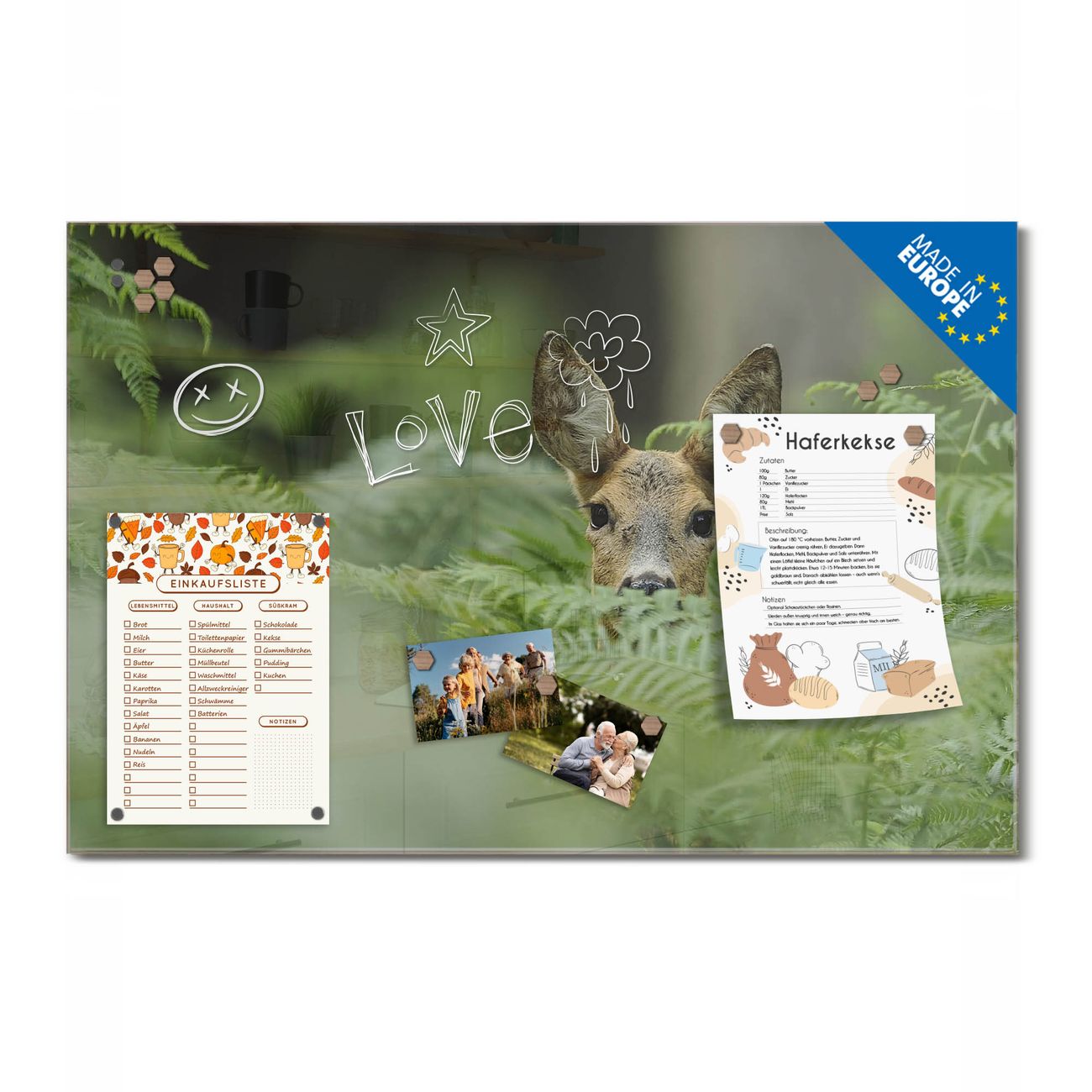 Ein Stück Design, das Ihren Alltag organisiert. Schreiben, heften, inspirieren - alles an einem Ort. Qualität, die man spürt. Montage leicht gemacht. Handwerk mit Herz - veredelt in Sachsen. Einzigartiges Design mit Motiv Motiv Reh Beschreibbare Glasoberfläche, leicht zu reinigen Starke Magnetkraft durch Stahlrückwand Inklusive 4 Neodym-Magneten Flexible Montageoptionen Handveredelt in Sachsen - Qualität, die bleibt