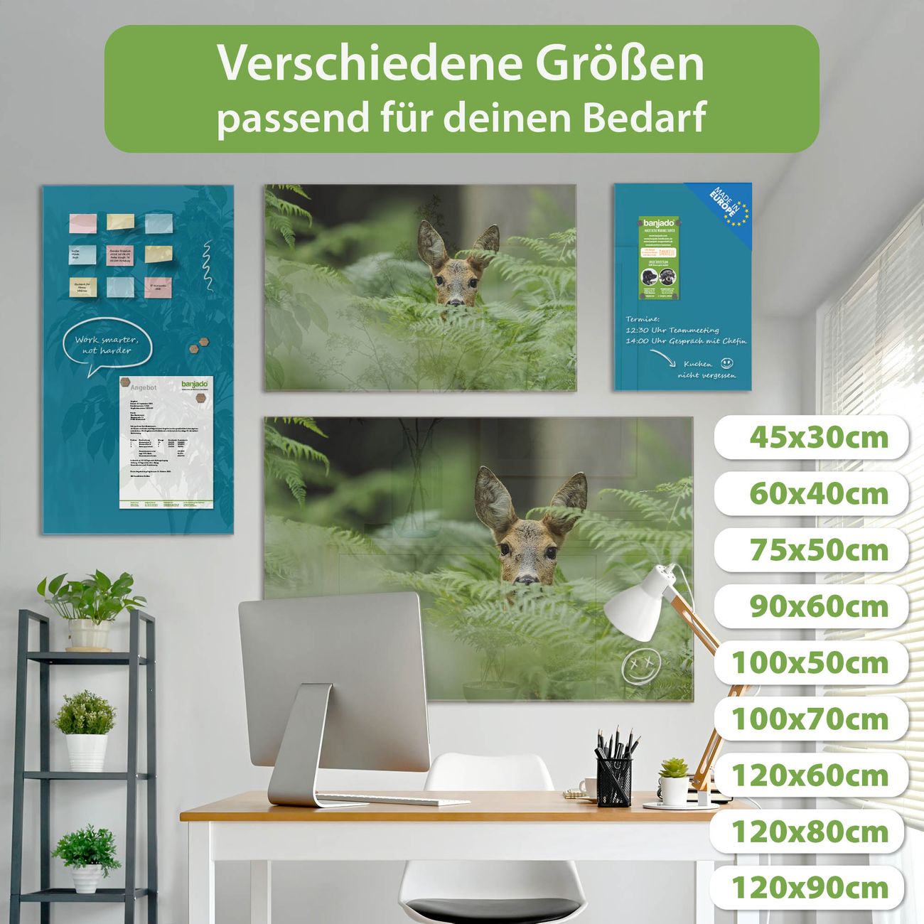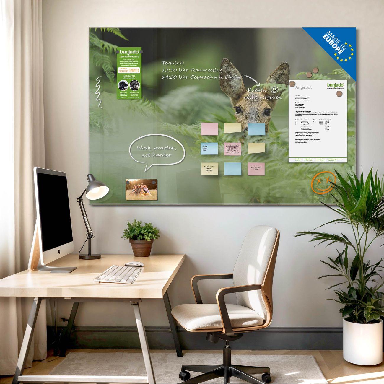 Jede Glas Magnettafel wird in unserer Werkstatt von Hand gefertigt und sorgfältig geprüft. So erhalten Sie ein echtes Qualitätsprodukt, das Funktion und Ästhetik perfekt vereint.?? Warum banjado?