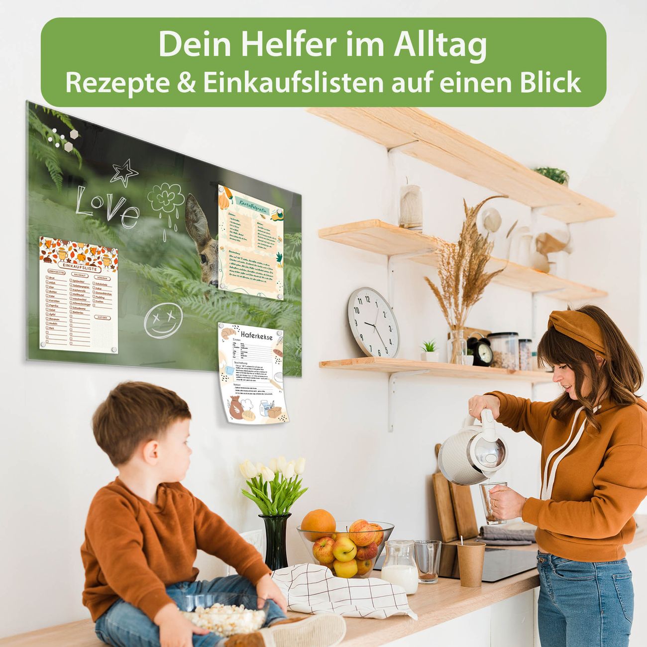Auf der glatten Glasoberfläche lassen sich Termine, Rezepte oder Notizen ganz einfach mit Kreidestiften festhalten und rückstandslos entfernen. Starke Neodym-Magnete halten Ihre wichtigsten Erinnerungen sicher an Ort und Stelle. So entsteht Ihre ganz persönliche Ideenwand - jeden Tag neu.
