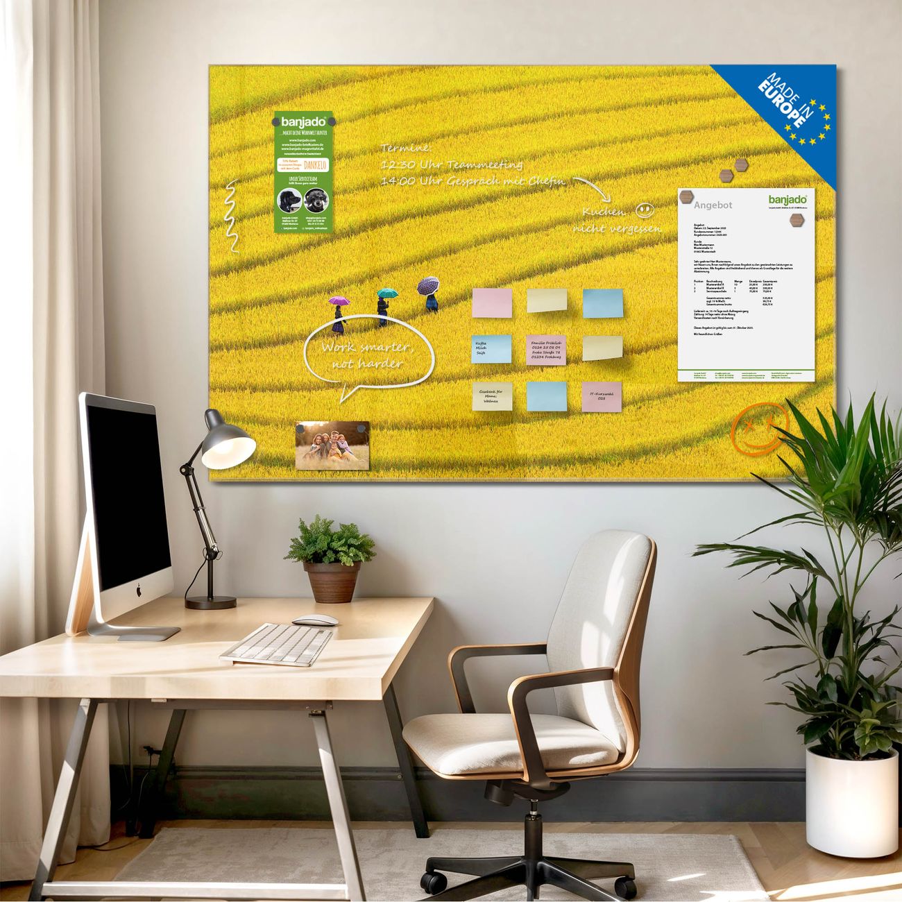 Jede Glas Magnettafel wird in unserer Werkstatt von Hand gefertigt und sorgfältig geprüft. So erhalten Sie ein echtes Qualitätsprodukt, das Funktion und Ästhetik perfekt vereint.?? Warum banjado?