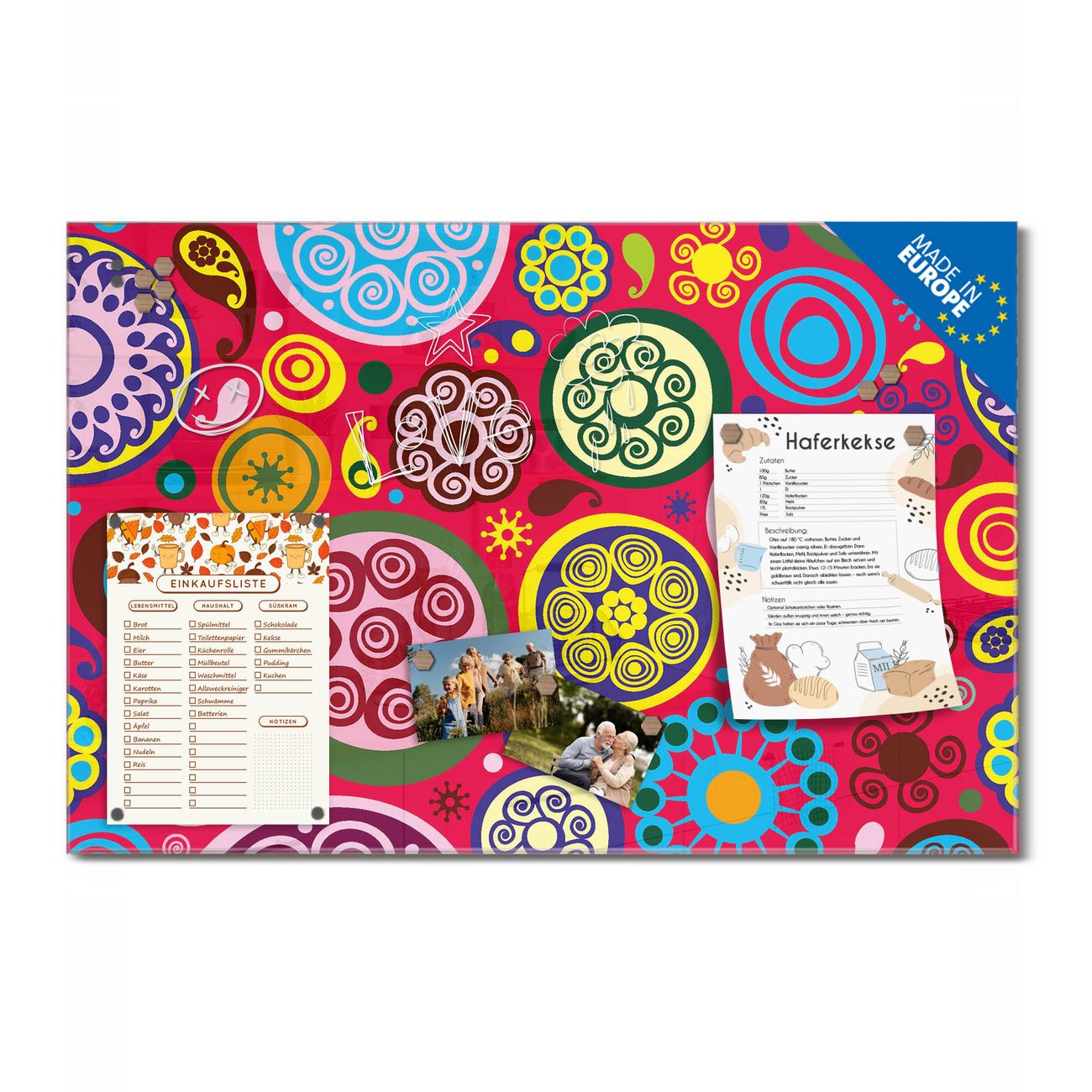 Ein Stück Design, das Ihren Alltag organisiert. Schreiben, heften, inspirieren - alles an einem Ort. Qualität, die man spürt. Montage leicht gemacht. Handwerk mit Herz - veredelt in Sachsen. Einzigartiges Design mit Motiv Motiv Retro Kreise Beschreibbare Glasoberfläche, leicht zu reinigen Starke Magnetkraft durch Stahlrückwand Inklusive 4 Neodym-Magneten Flexible Montageoptionen Handveredelt in Sachsen - Qualität, die bleibt