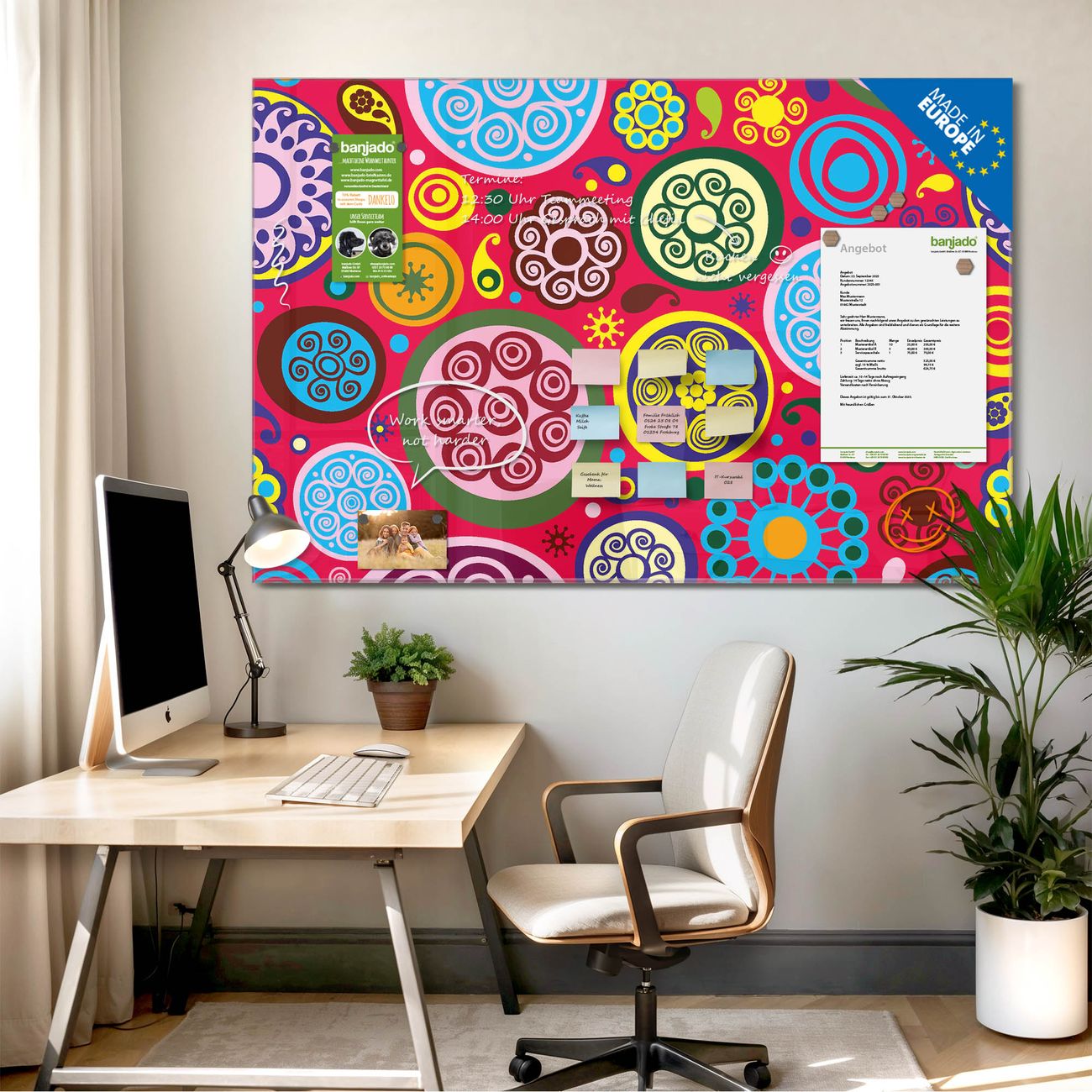Jede Glas Magnettafel wird in unserer Werkstatt von Hand gefertigt und sorgfältig geprüft. So erhalten Sie ein echtes Qualitätsprodukt, das Funktion und Ästhetik perfekt vereint.?? Warum banjado?