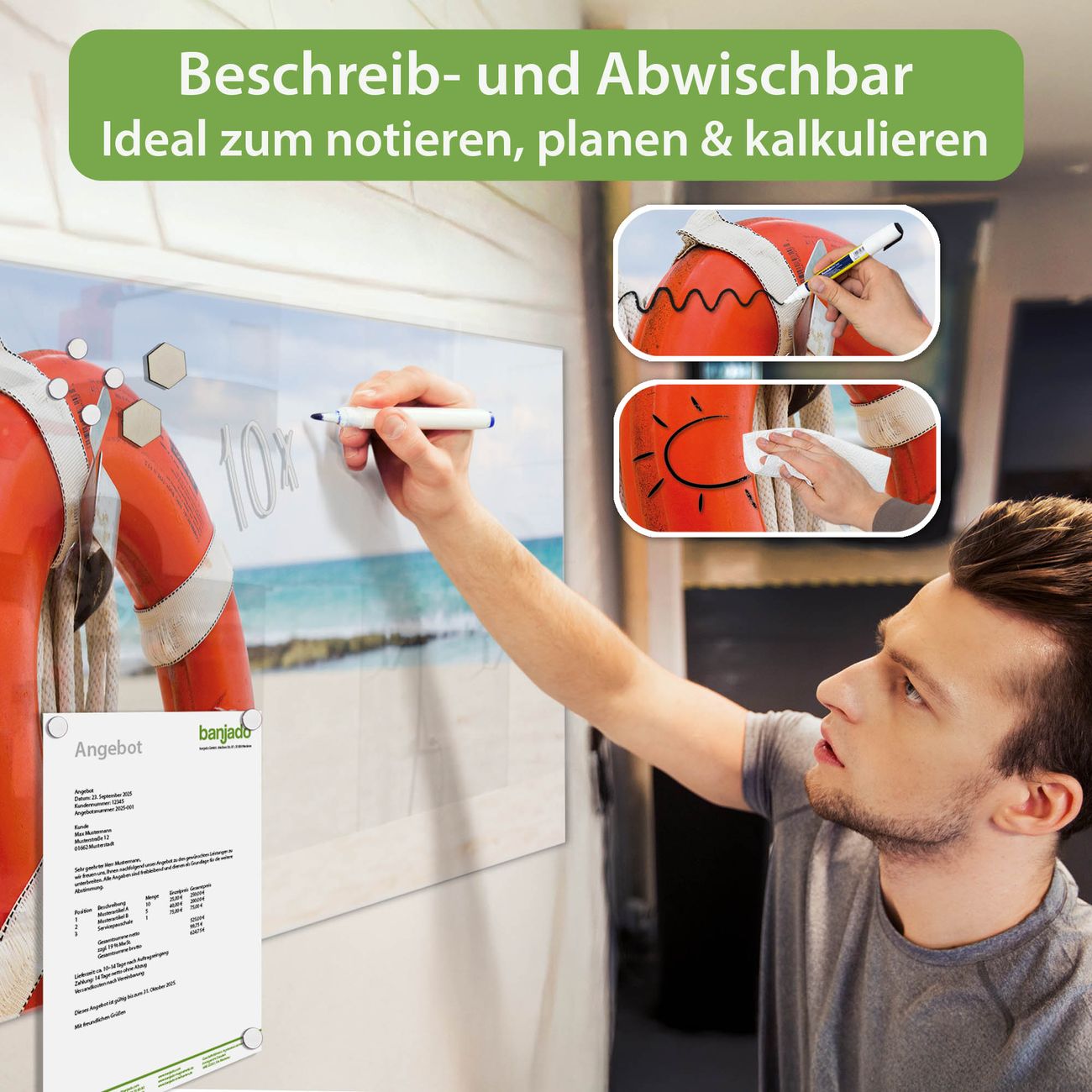 Die banjado Glas Magnettafel mit dem Motiv Motiv Roter Rettungsring verbindet Funktionalität mit Stil. Sie ersetzt das Zettelchaos durch klare Strukturen und bringt dabei eine warme, natürliche Atmosphäre in Ihr Zuhause. Ob im Büro, in der Küche oder im Eingangsbereich - dieses Design-Board zieht Blicke an und sorgt für Ordnung mit Charakter.