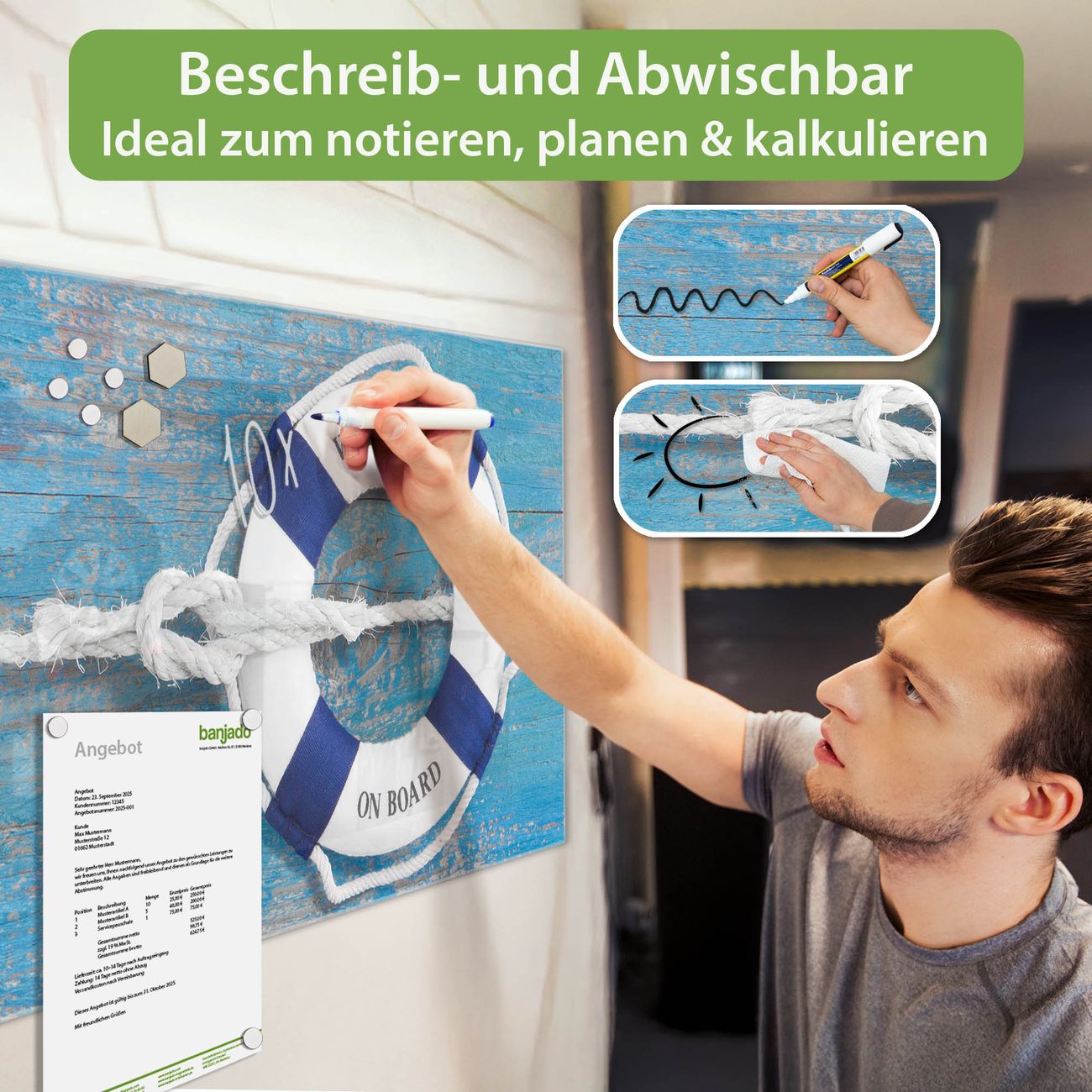 Die banjado Glas Magnettafel mit dem Motiv Motiv Blauer Rettungsring verbindet Funktionalität mit Stil. Sie ersetzt das Zettelchaos durch klare Strukturen und bringt dabei eine warme, natürliche Atmosphäre in Ihr Zuhause. Ob im Büro, in der Küche oder im Eingangsbereich - dieses Design-Board zieht Blicke an und sorgt für Ordnung mit Charakter.