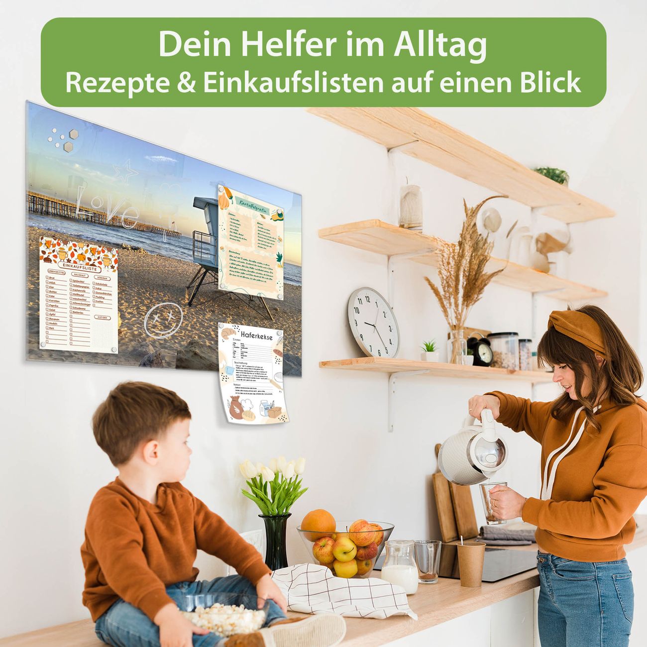 Auf der glatten Glasoberfläche lassen sich Termine, Rezepte oder Notizen ganz einfach mit Kreidestiften festhalten und rückstandslos entfernen. Starke Neodym-Magnete halten Ihre wichtigsten Erinnerungen sicher an Ort und Stelle. So entsteht Ihre ganz persönliche Ideenwand - jeden Tag neu.
