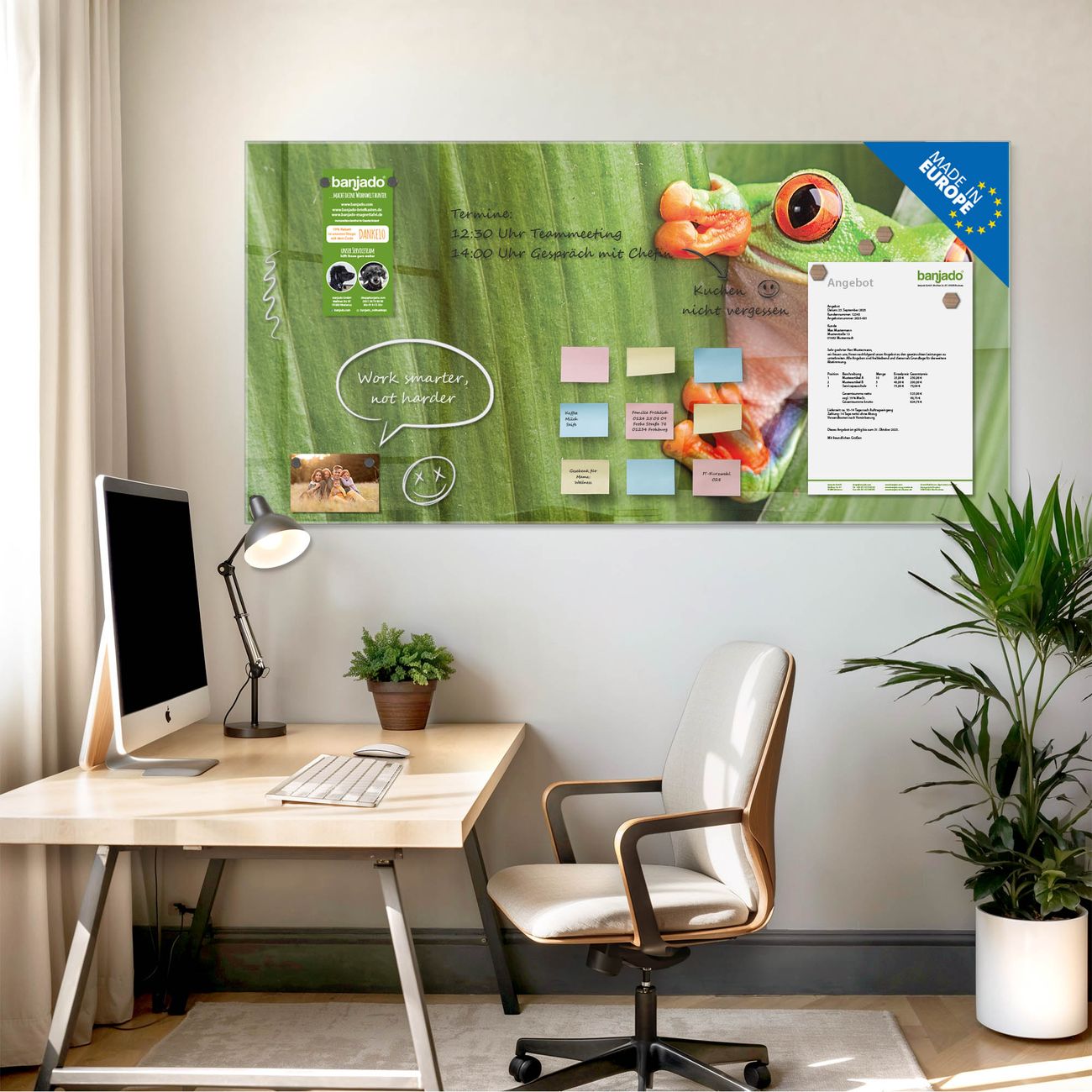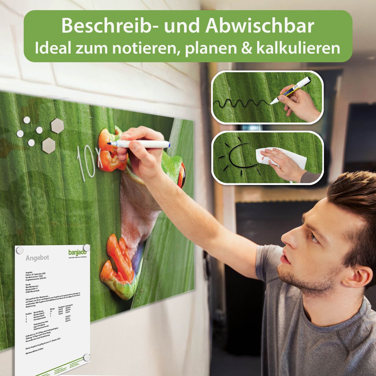 Jede Glas Magnettafel wird in unserer Werkstatt von Hand gefertigt und sorgfältig geprüft. So erhalten Sie ein echtes Qualitätsprodukt, das Funktion und Ästhetik perfekt vereint.?? Warum banjado?