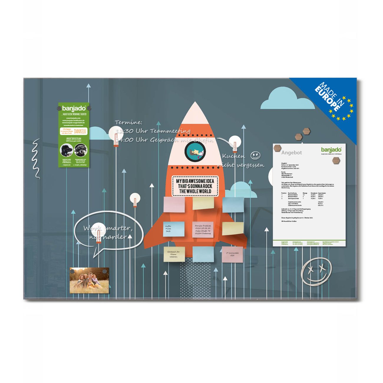 Jede Glas Magnettafel wird in unserer Werkstatt von Hand gefertigt und sorgfältig geprüft. So erhalten Sie ein echtes Qualitätsprodukt, das Funktion und Ästhetik perfekt vereint.?? Warum banjado?