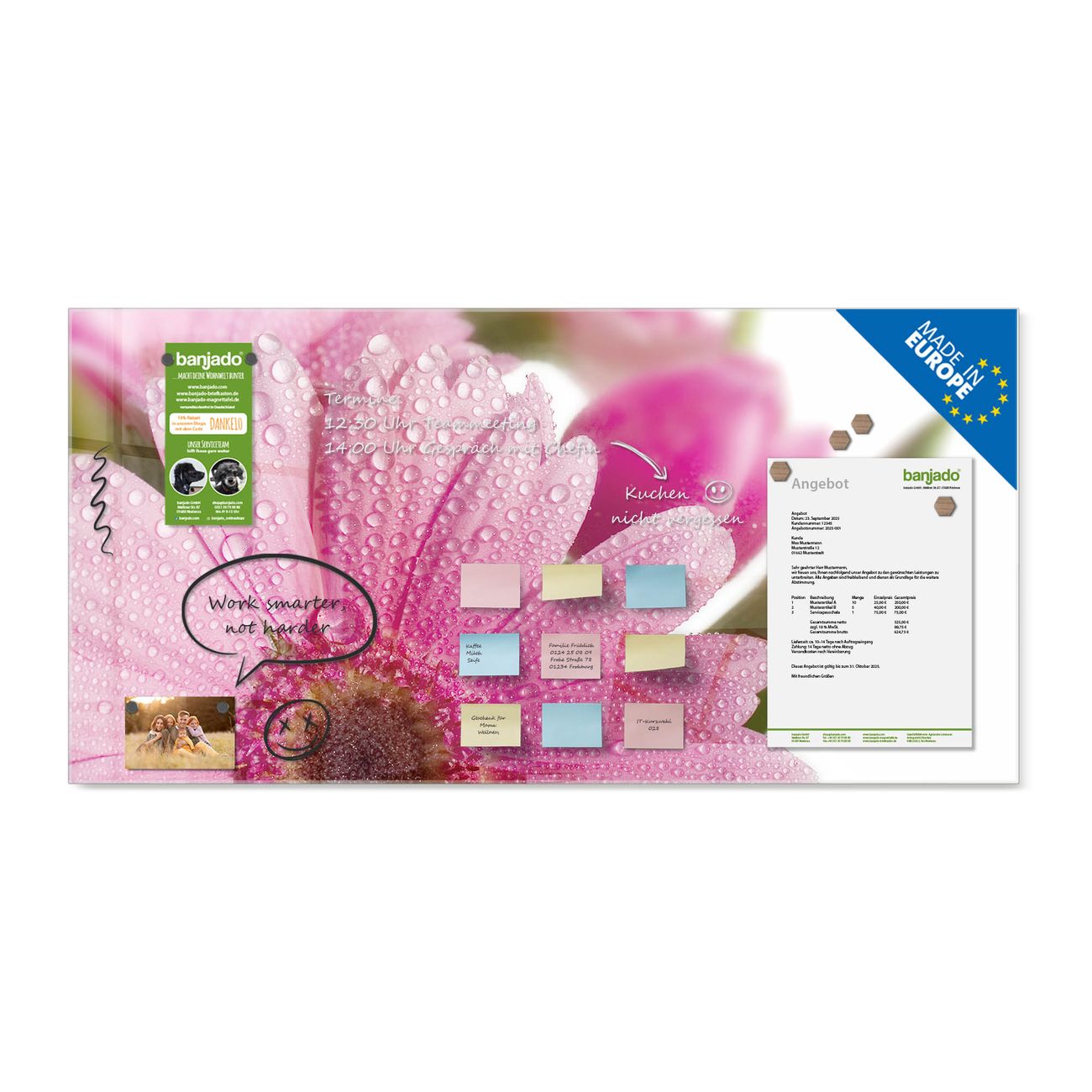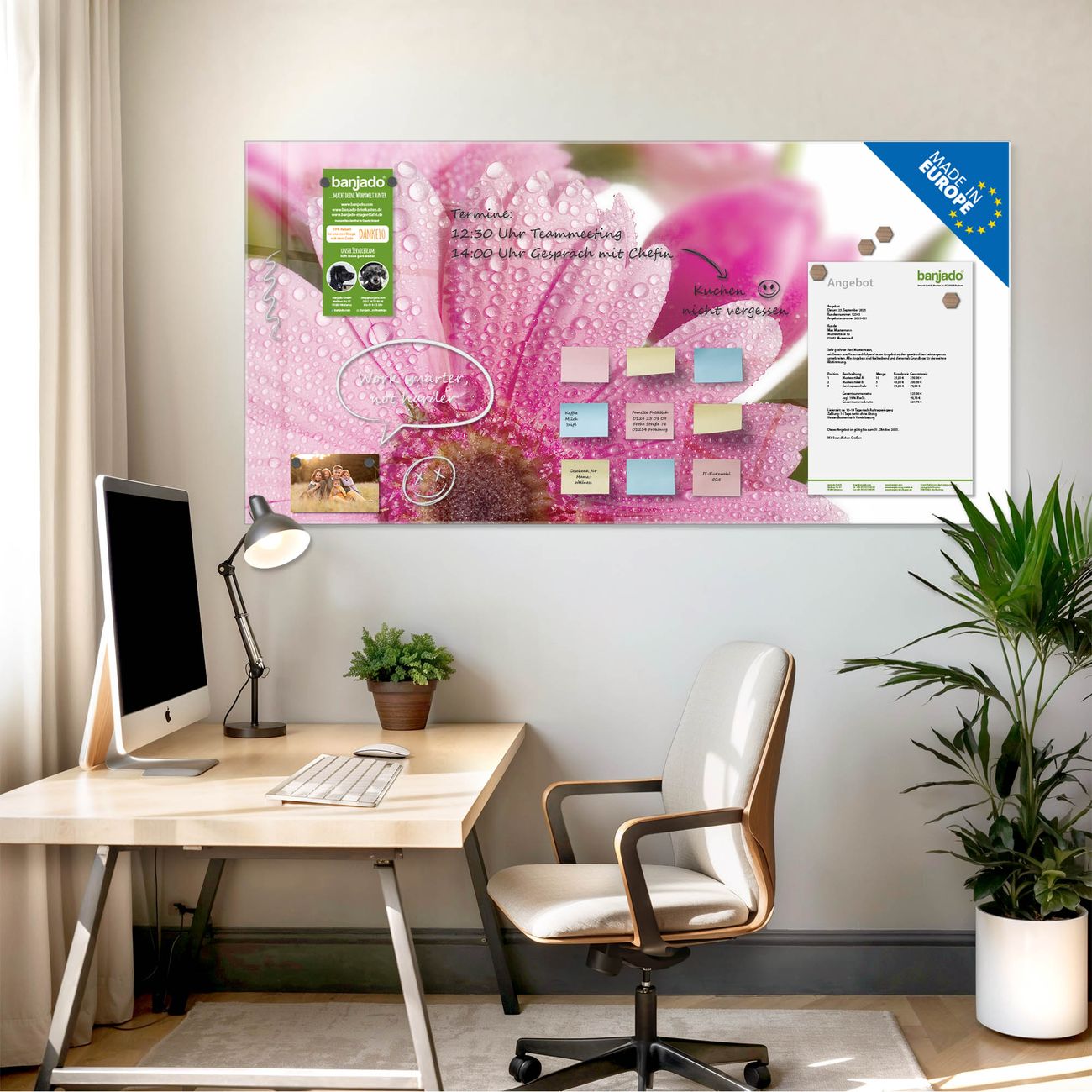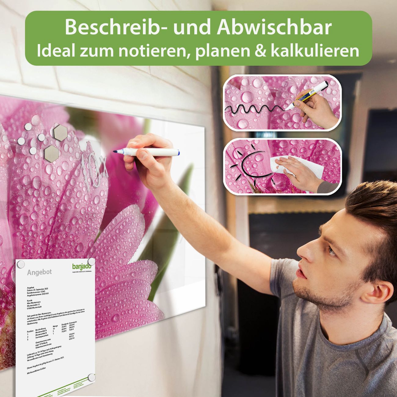 Jede Glas Magnettafel wird in unserer Werkstatt von Hand gefertigt und sorgfältig geprüft. So erhalten Sie ein echtes Qualitätsprodukt, das Funktion und Ästhetik perfekt vereint.?? Warum banjado?