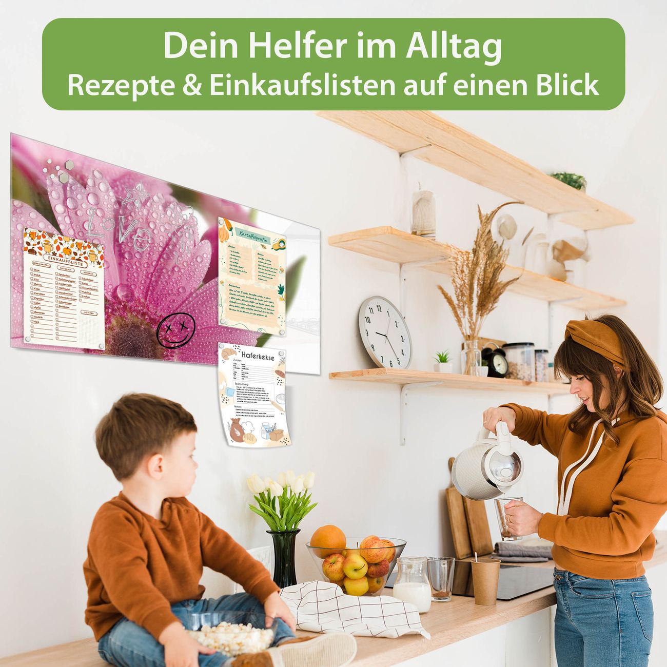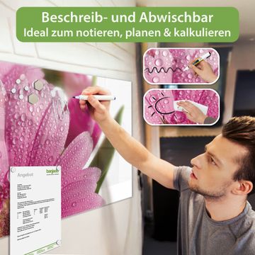 Auf der glatten Glasoberfläche lassen sich Termine, Rezepte oder Notizen ganz einfach mit Kreidestiften festhalten und rückstandslos entfernen. Starke Neodym-Magnete halten Ihre wichtigsten Erinnerungen sicher an Ort und Stelle. So entsteht Ihre ganz persönliche Ideenwand - jeden Tag neu.