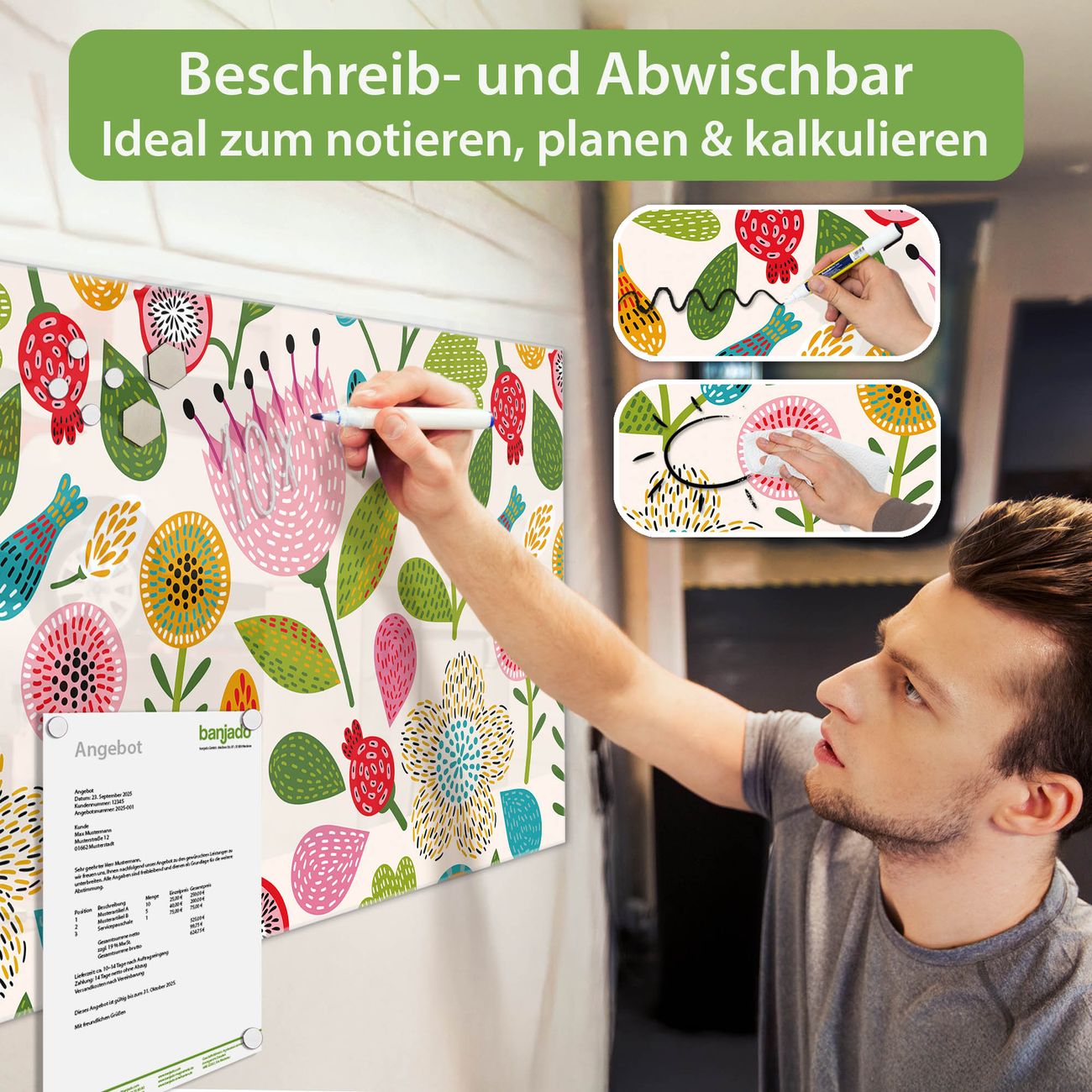 Auf der glatten Glasoberfläche lassen sich Termine, Rezepte oder Notizen ganz einfach mit Kreidestiften festhalten und rückstandslos entfernen. Starke Neodym-Magnete halten Ihre wichtigsten Erinnerungen sicher an Ort und Stelle. So entsteht Ihre ganz persönliche Ideenwand - jeden Tag neu.
