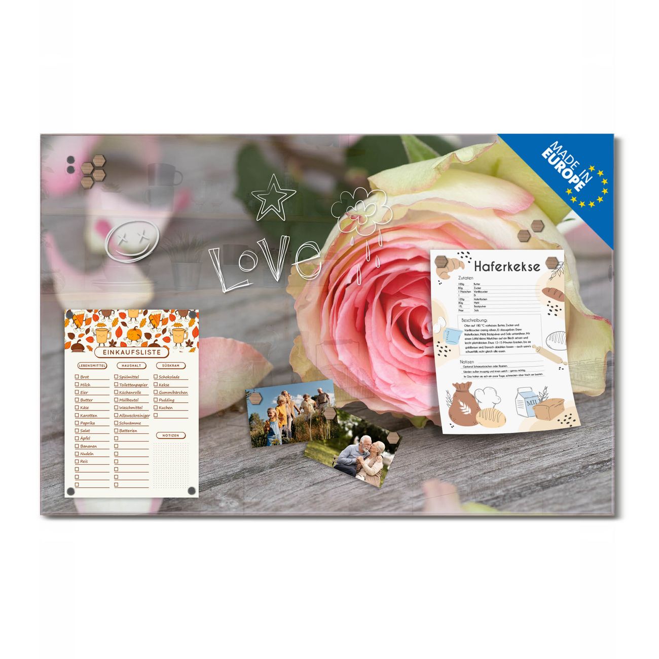 Ein Stück Design, das Ihren Alltag organisiert. Schreiben, heften, inspirieren - alles an einem Ort. Qualität, die man spürt. Montage leicht gemacht. Handwerk mit Herz - veredelt in Sachsen. Einzigartiges Design mit Motiv Motiv Rosa Rose Beschreibbare Glasoberfläche, leicht zu reinigen Starke Magnetkraft durch Stahlrückwand Inklusive 4 Neodym-Magneten Flexible Montageoptionen Handveredelt in Sachsen - Qualität, die bleibt