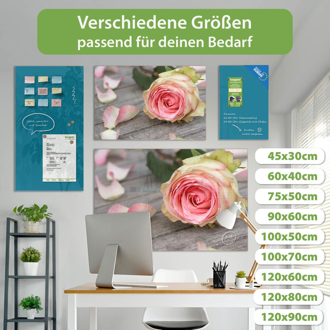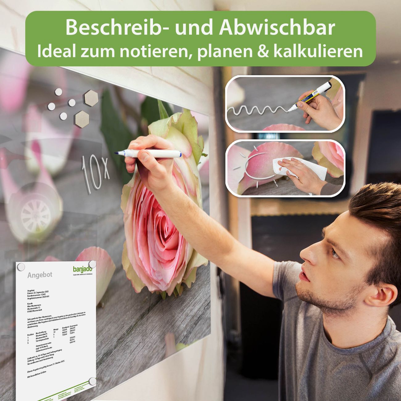 Jede Glas Magnettafel wird in unserer Werkstatt von Hand gefertigt und sorgfältig geprüft. So erhalten Sie ein echtes Qualitätsprodukt, das Funktion und Ästhetik perfekt vereint.?? Warum banjado?