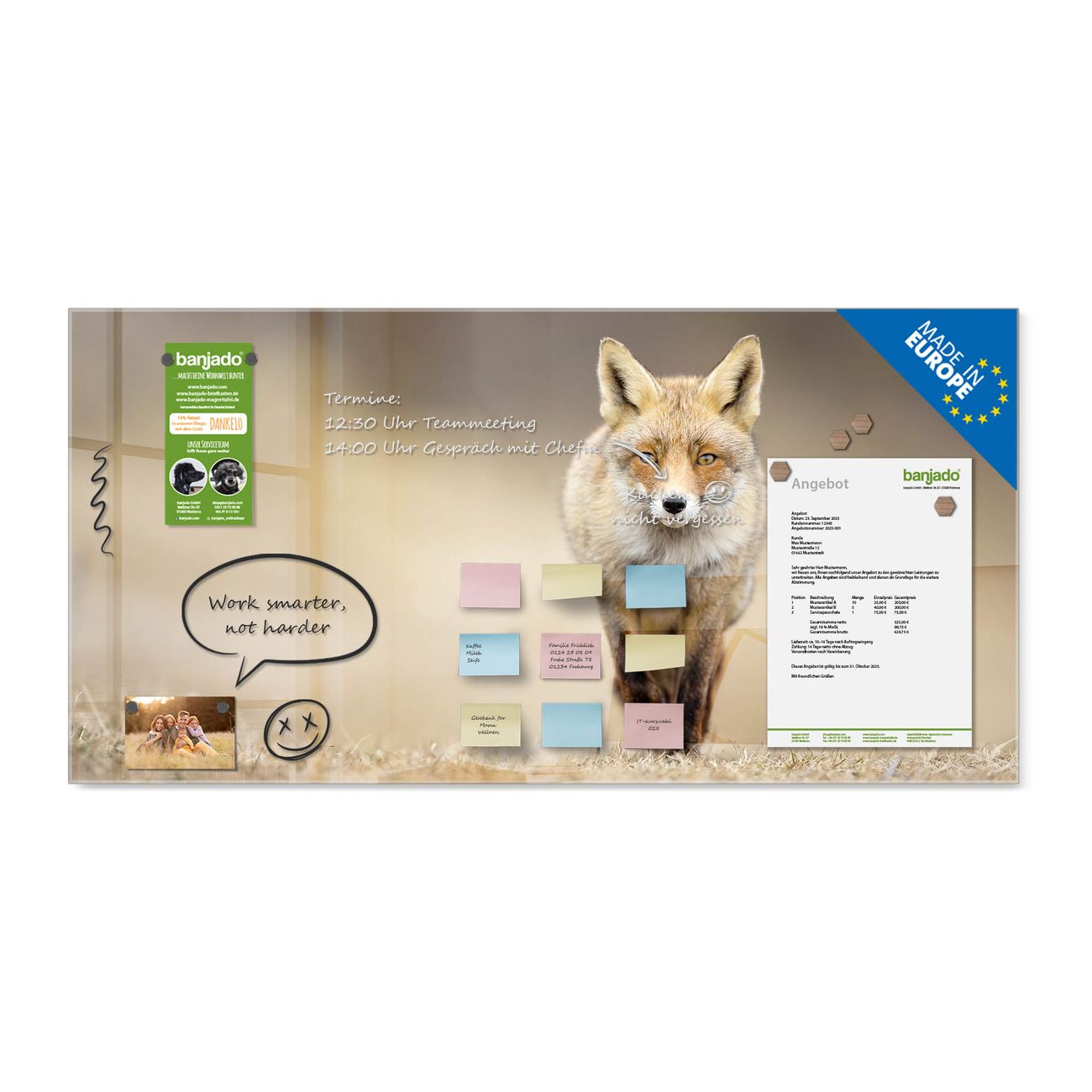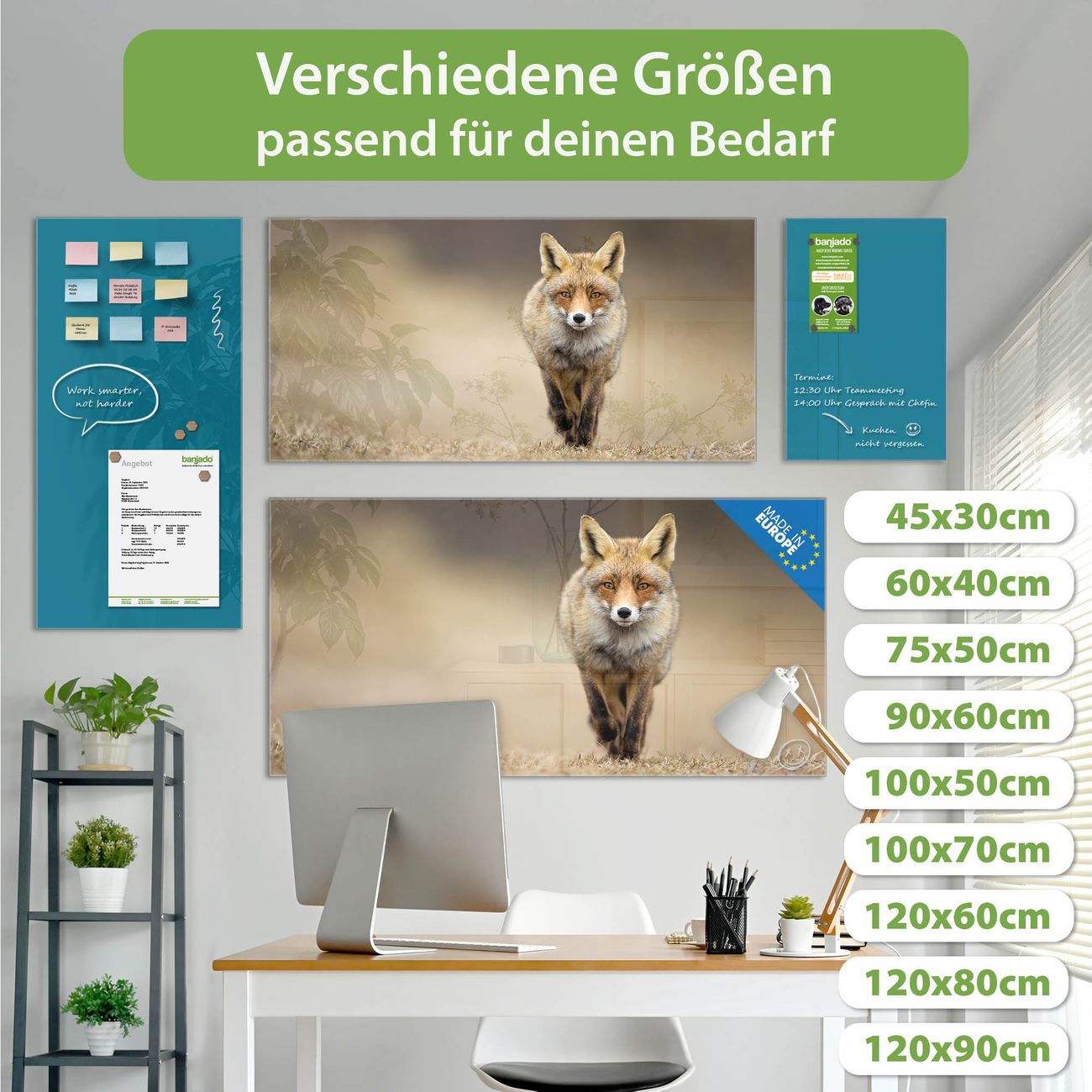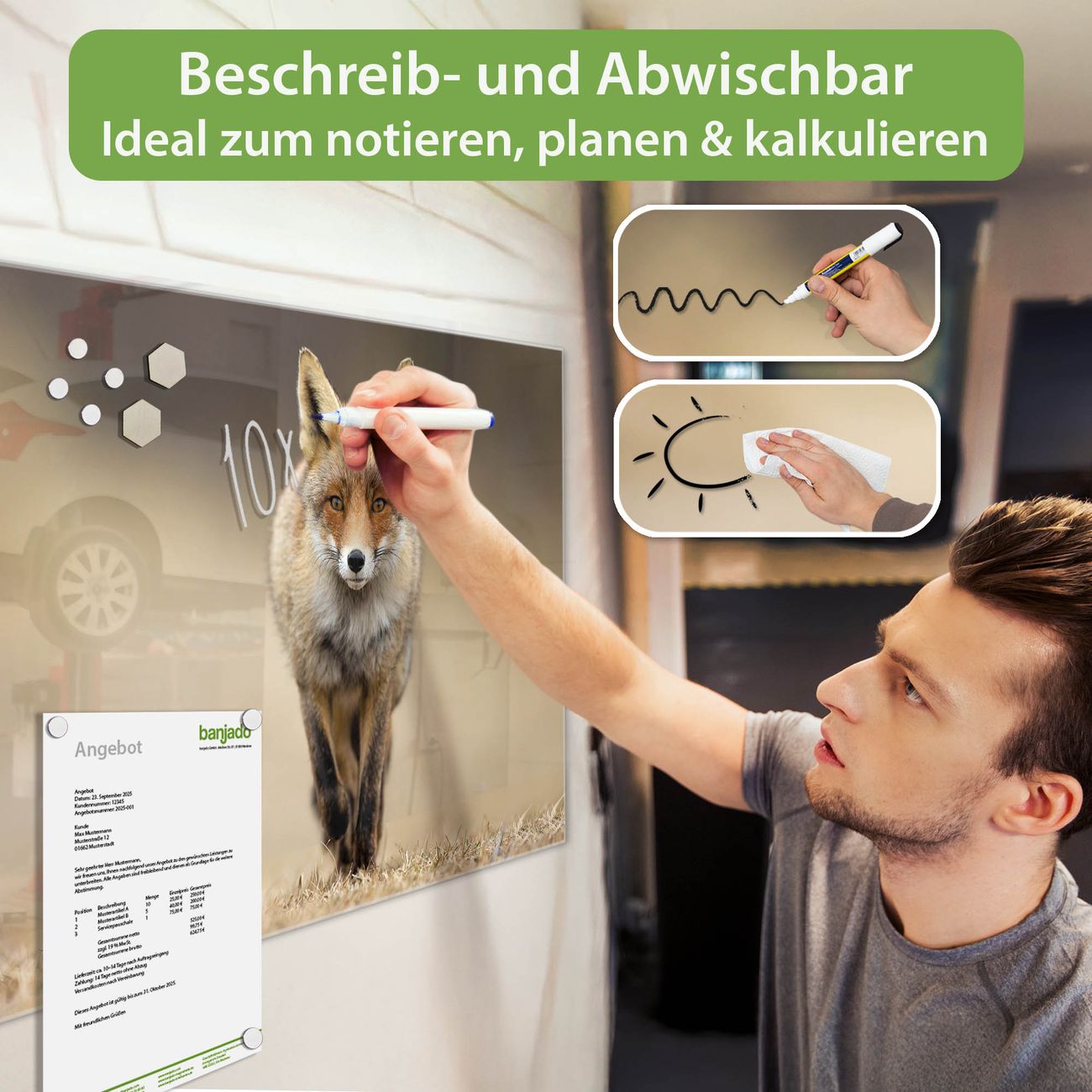 Jede Glas Magnettafel wird in unserer Werkstatt von Hand gefertigt und sorgfältig geprüft. So erhalten Sie ein echtes Qualitätsprodukt, das Funktion und Ästhetik perfekt vereint.?? Warum banjado?