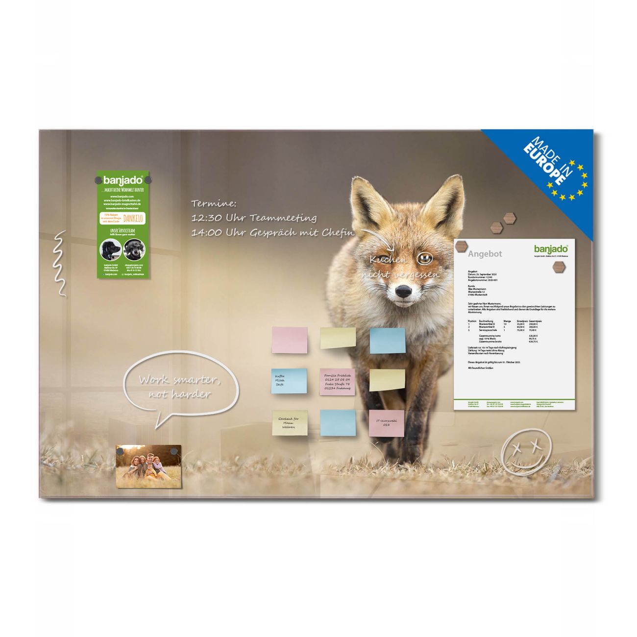 Jede Glas Magnettafel wird in unserer Werkstatt von Hand gefertigt und sorgfältig geprüft. So erhalten Sie ein echtes Qualitätsprodukt, das Funktion und Ästhetik perfekt vereint.?? Warum banjado?