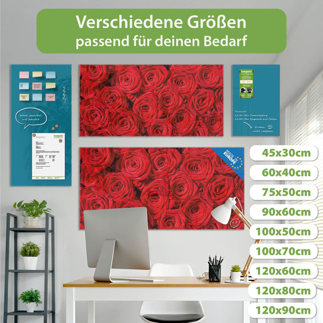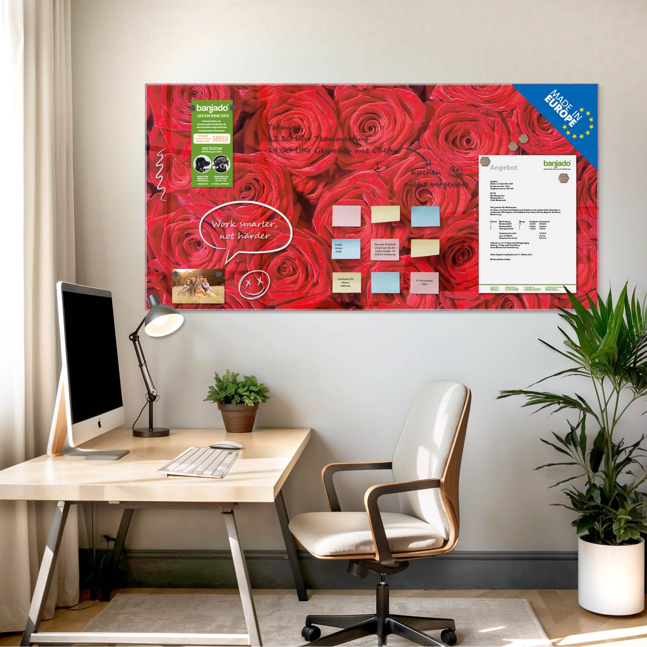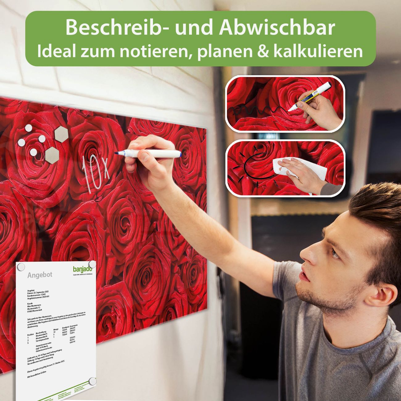 Jede Glas Magnettafel wird in unserer Werkstatt von Hand gefertigt und sorgfältig geprüft. So erhalten Sie ein echtes Qualitätsprodukt, das Funktion und Ästhetik perfekt vereint.?? Warum banjado?