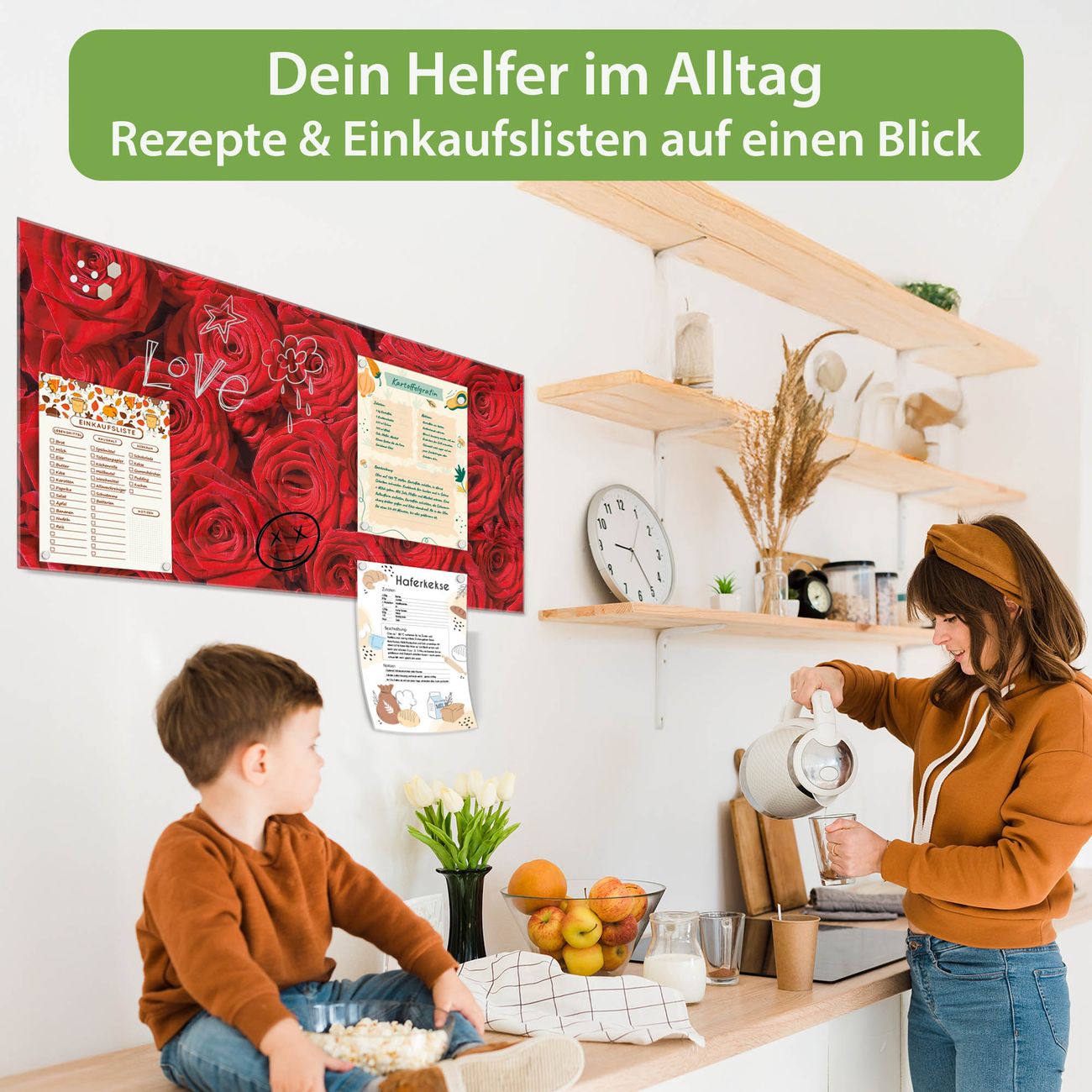 Auf der glatten Glasoberfläche lassen sich Termine, Rezepte oder Notizen ganz einfach mit Kreidestiften festhalten und rückstandslos entfernen. Starke Neodym-Magnete halten Ihre wichtigsten Erinnerungen sicher an Ort und Stelle. So entsteht Ihre ganz persönliche Ideenwand - jeden Tag neu.