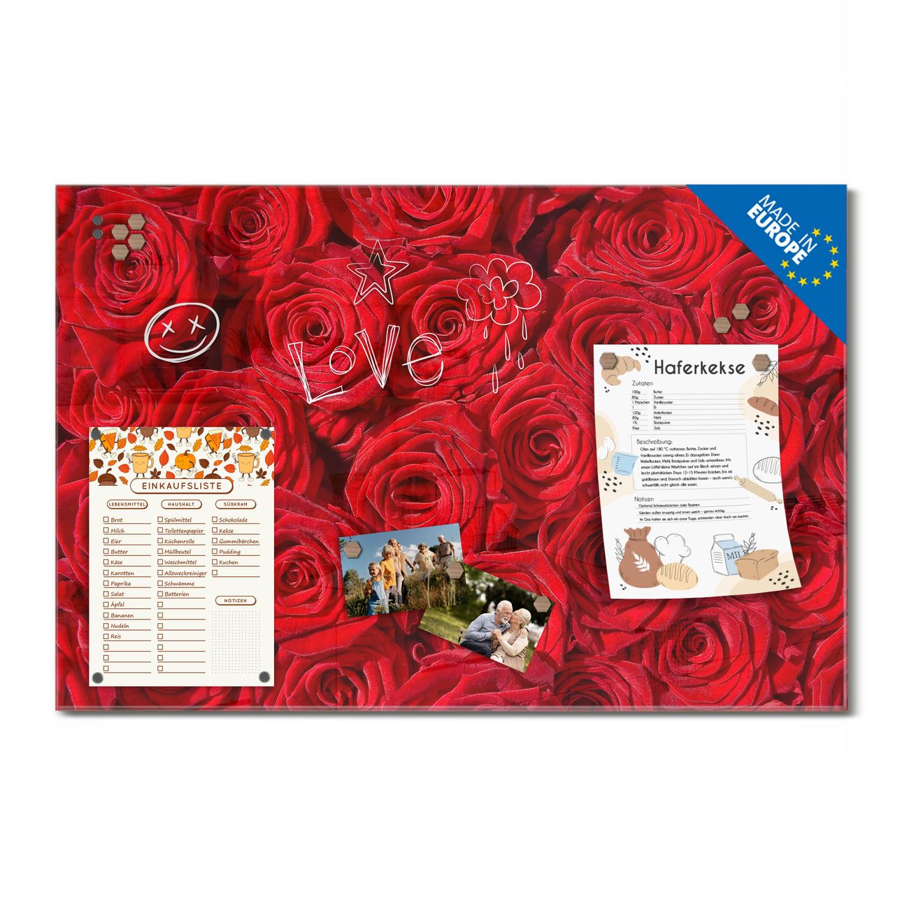 Ein Stück Design, das Ihren Alltag organisiert. Schreiben, heften, inspirieren - alles an einem Ort. Qualität, die man spürt. Montage leicht gemacht. Handwerk mit Herz - veredelt in Sachsen. Einzigartiges Design mit Motiv Motiv Rosenbett Beschreibbare Glasoberfläche, leicht zu reinigen Starke Magnetkraft durch Stahlrückwand Inklusive 4 Neodym-Magneten Flexible Montageoptionen Handveredelt in Sachsen - Qualität, die bleibt