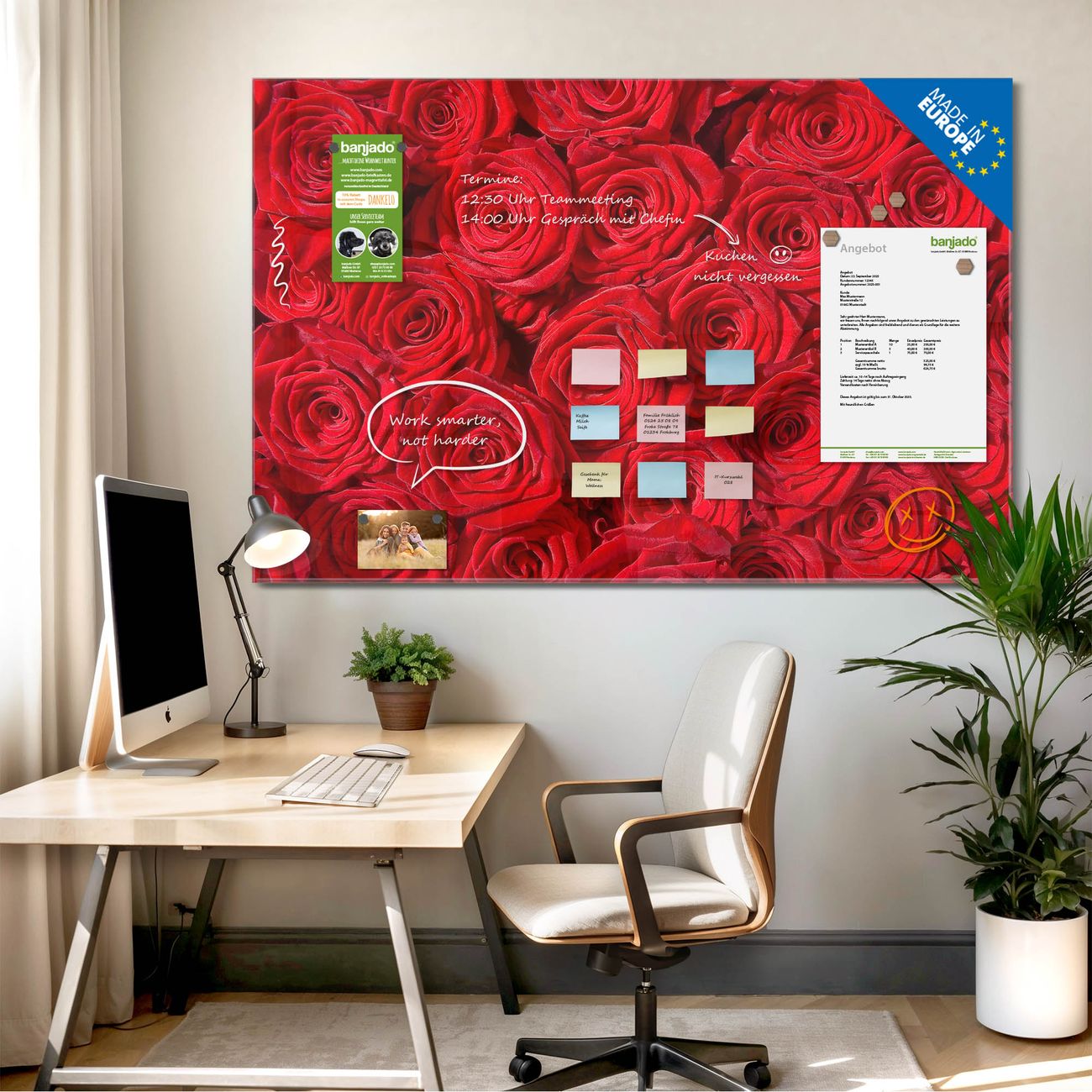 Jede Glas Magnettafel wird in unserer Werkstatt von Hand gefertigt und sorgfältig geprüft. So erhalten Sie ein echtes Qualitätsprodukt, das Funktion und Ästhetik perfekt vereint.?? Warum banjado?